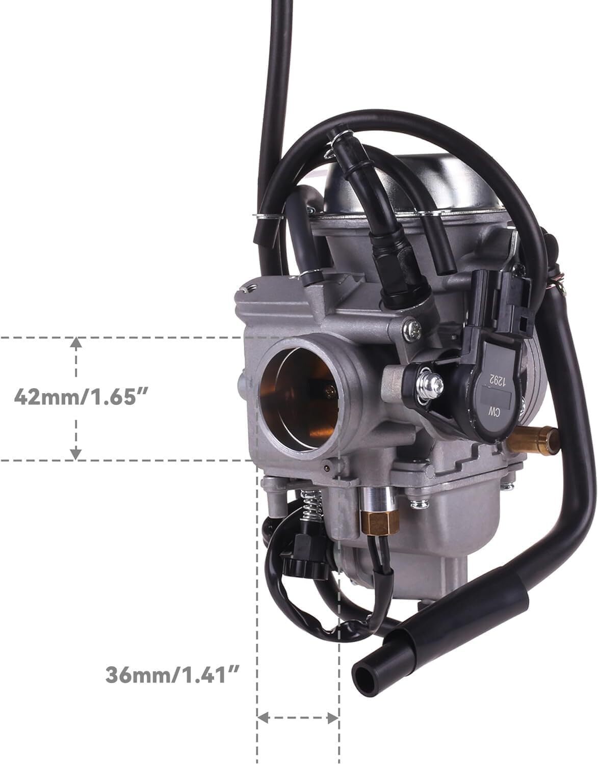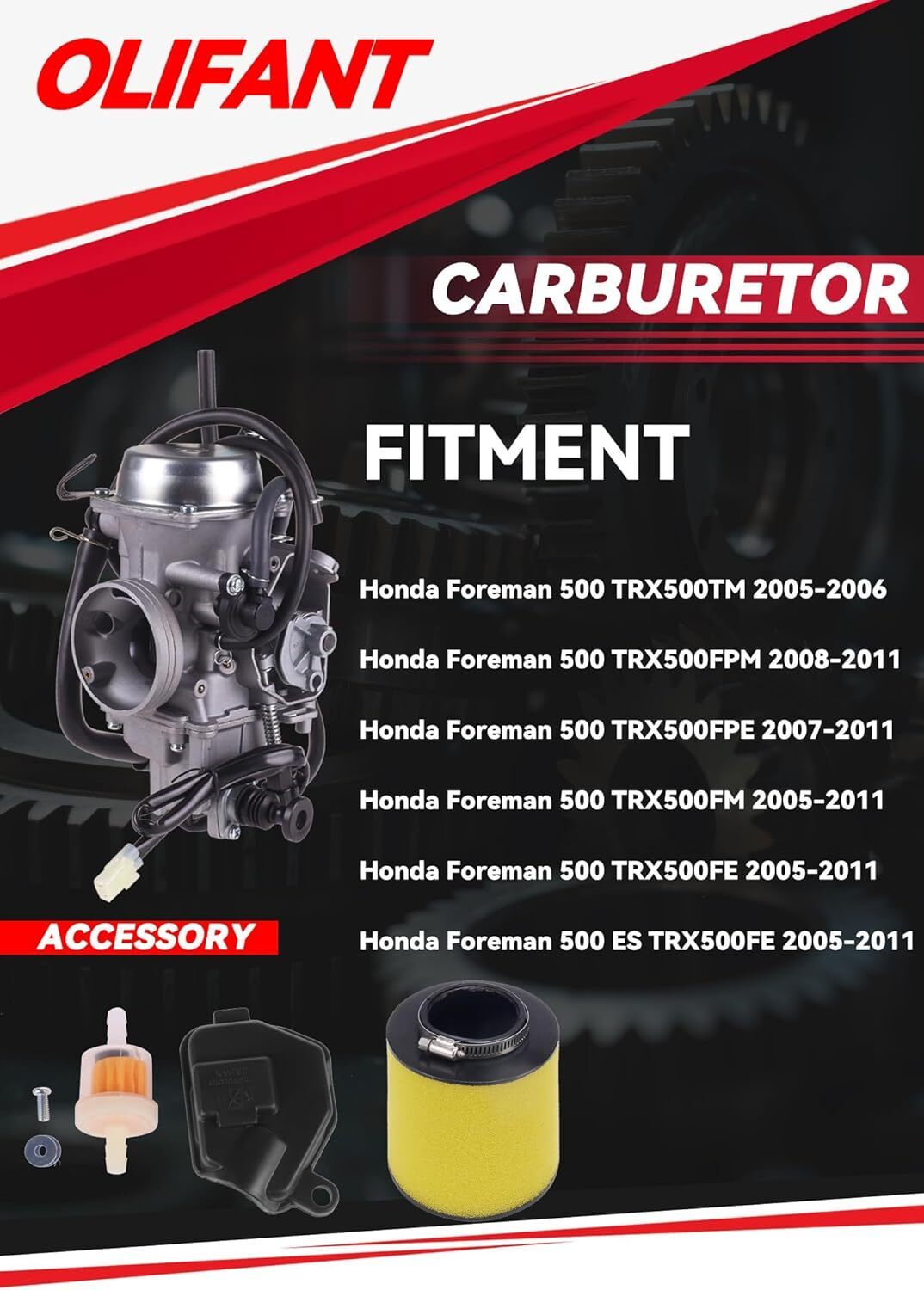 Carburetor For Honda Foreman 500 TRX500TM 2005-2006/Foreman 500 TRX500FPM 2008-2011 Carburetor For Honda Foreman 500 TRX500FPE 2007-2011/Foreman 500 TRX500FM 2005-2011 Carburetor For Honda Foreman 500 TRX500FE 2005-2011/Foreman 500 ES TRX500FE 2005-2011(not for Rubicon models!!!) Specs:Intake Side inner Diameter : 36mm/1.41inch;Intake Side Outer Diameter :42mm/1.65inch;Air Filter Mount inner Diameter :54mm/2.12inch;Air Filter Mount Outer Diameter : 58mm/2.28inch Package include:1XCarburetor,1XAir Filter,1XOil Filter,1XThrottle Base Cover x1,1XBase Cover Screw kit x1 Feature:The carburetor has the function of regulating fuel flow, adjusting engine speed and adapting to different environmental conditions