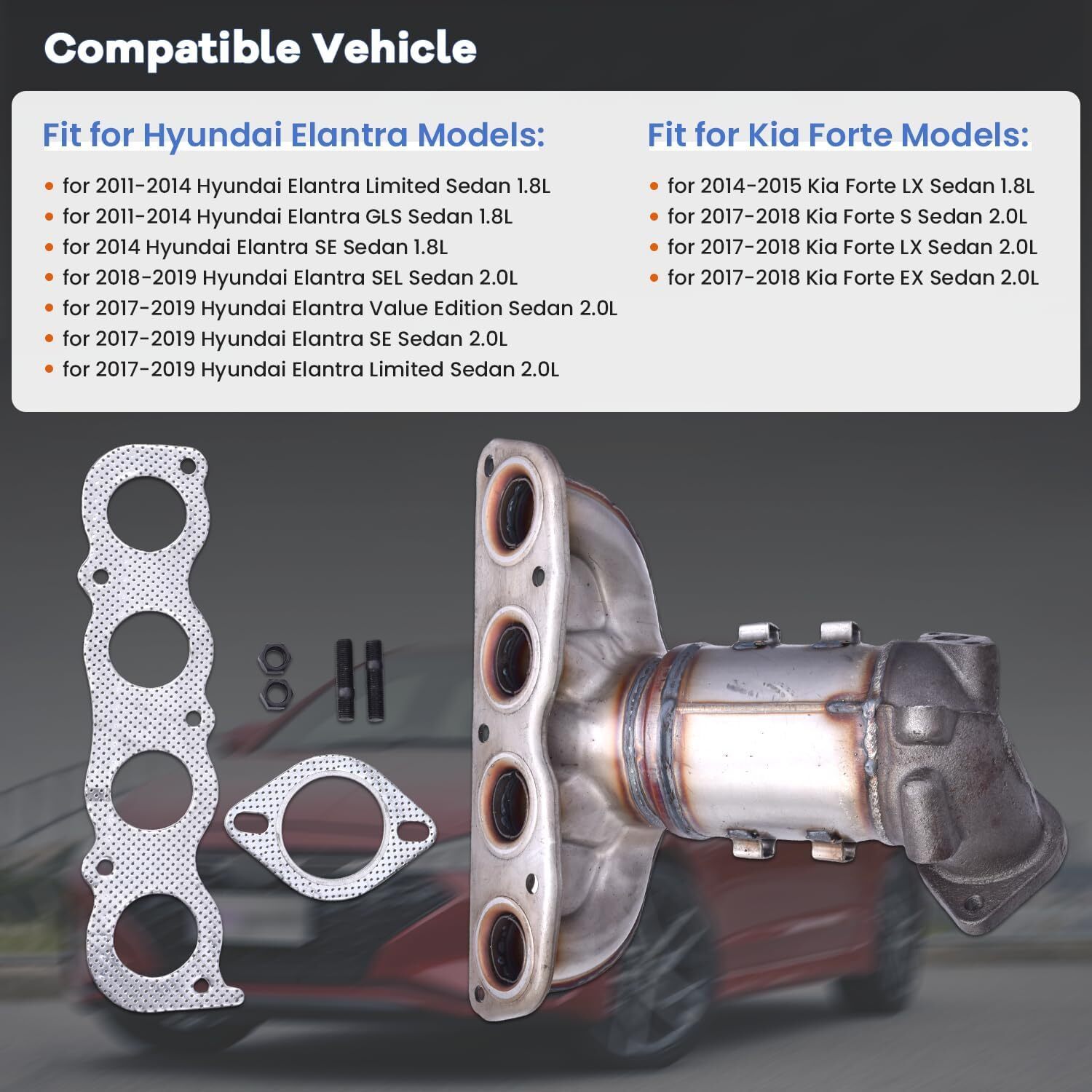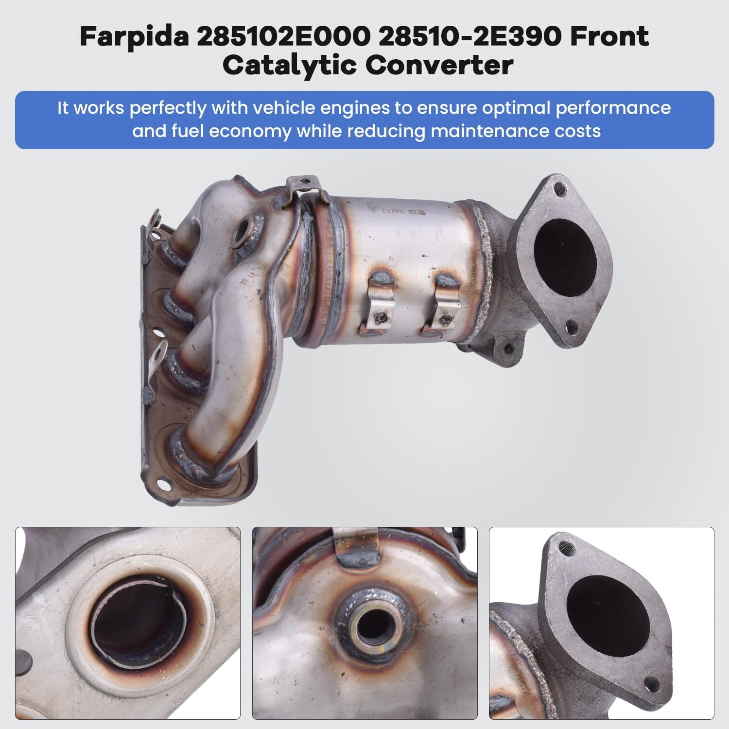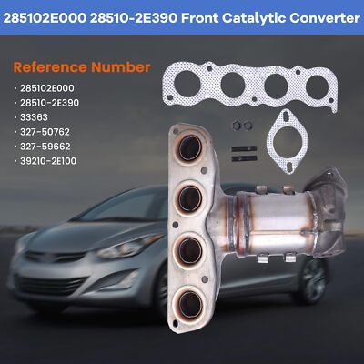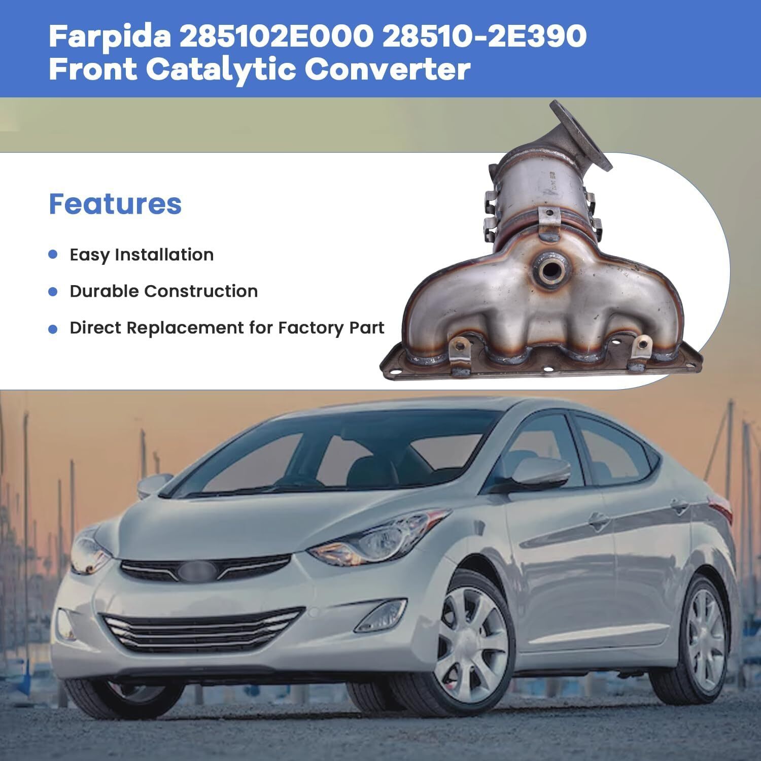 ?OE Part Number?This Front Catalytic Converter Replace 285102E000, 28510-2E390, 33363, 327-50762, 327-59662, 39210-2E100. Please confirm the model number before you buy, and through the display pictures for comparison, to make sure that you get. ?Vehicle Fitment?28510-2E390 Front Catalytic Converter Fits for 2011-2014 Hyundai Elantra 1.8L, Fits for 2017-2019 Hyundai Elantra 2.0L, Fits for 2014-2015 Kia Forte 1.8L, Fits for 2017-2018 Kia Forte 2.0L . Please double check the above compatibility table, part photos, OE part number and part description to make sure it is what you need. ?Higher Quality?28510-2E390 Front Catalytic Converter is made of Higher quality materials combined with meticulous manufacturing and stringent testing, ensure reliable quality and durability. ?Easy to install?285102E000 Front Catalytic Converter is easy to install, direct replacement, ready to use. ?Service?At Farpida, we provide 7/24 response service. Low risk purchase is for every customer's smile. If you have any quality problems with your product, please contact us and we will replace your parts with new ones for fr-ee .