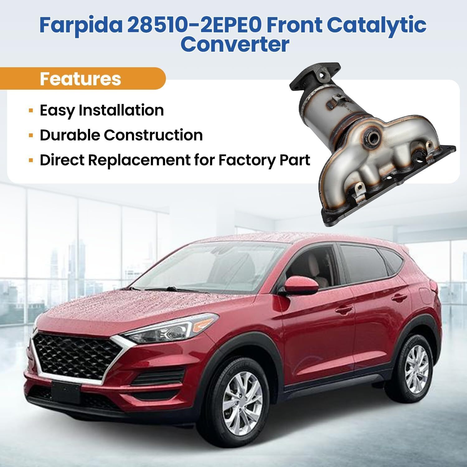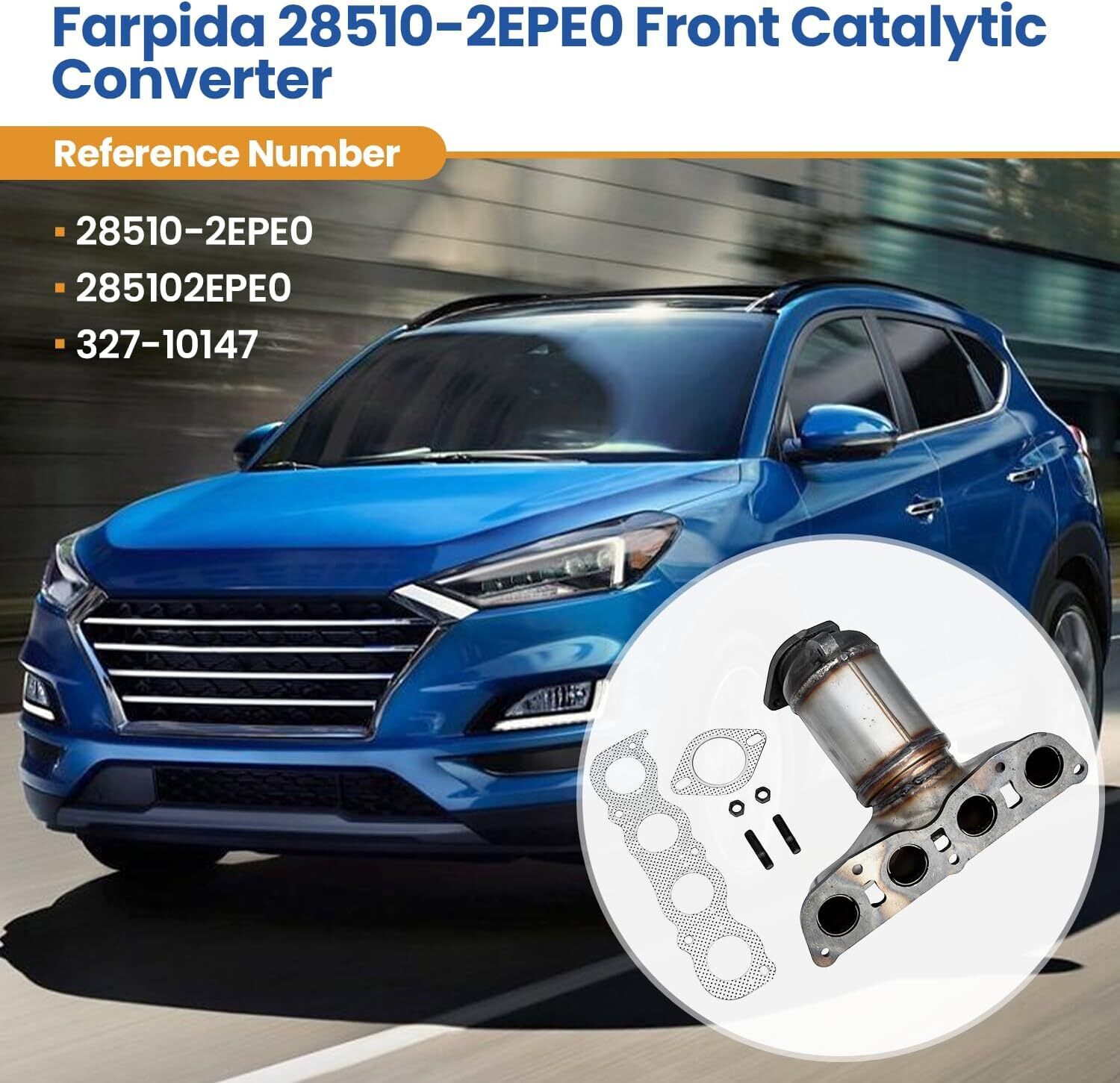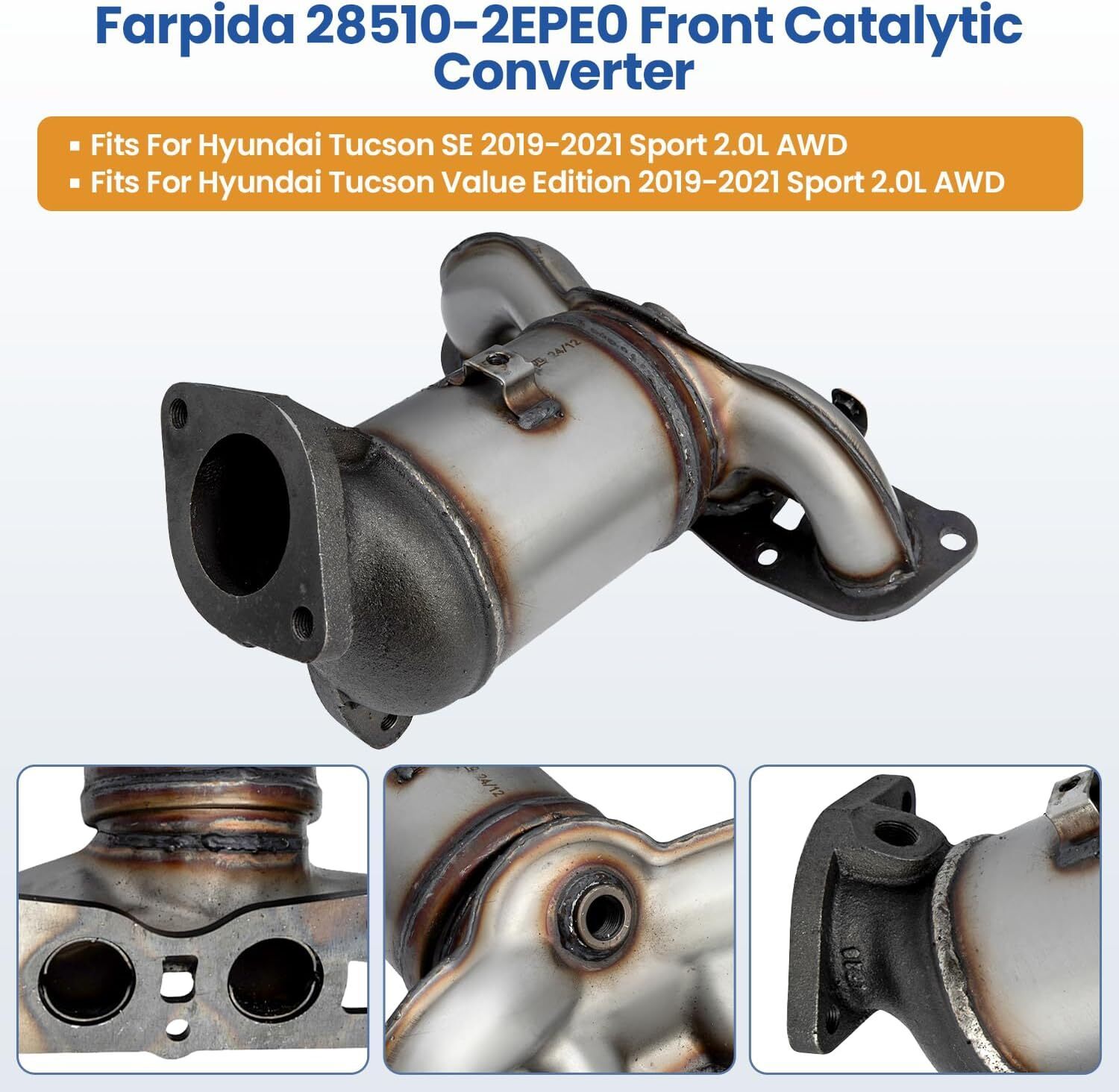?OE Part Number?This Front Catalytic Converter Repalce 28510-2EPE0, 285102EPE0, 327-10147. Please confirm the model number before you buy, and through the display pictures for comparison, to make sure that you get. ?Vehicle Fitment?This 28510-2EPE0 Catalytic Converter Fits for Hyundai Tucson SE 2019-2021 Sport 2.0L AWD, fits for Hyundai Tucson Value Edition 2019-2021 Sport 2.0L AWD. Please double check the above compatibility table, part photos, OE part number and part description to make sure it is what you need. ?Higher Quality?285102EPE0 Catalytic Converter is made of Higher quality materials combined with meticulous manufacturing and stringent testing, ensure reliable quality and durability. ?Easy to install?327-10147 Front Catalytic Converter is easy to install, direct replacement, ready to use. ?Service?At Farpida, we provide 7/24 response service. Low risk purchase is for every customer's smile. If you have any quality problems with your product, please contact us and we will replace your parts with new ones for fr-ee .
