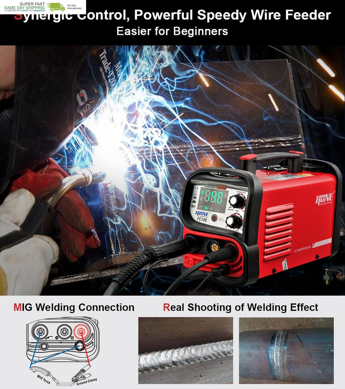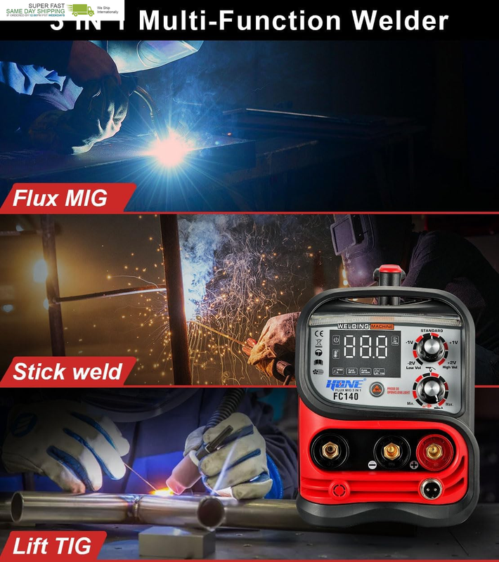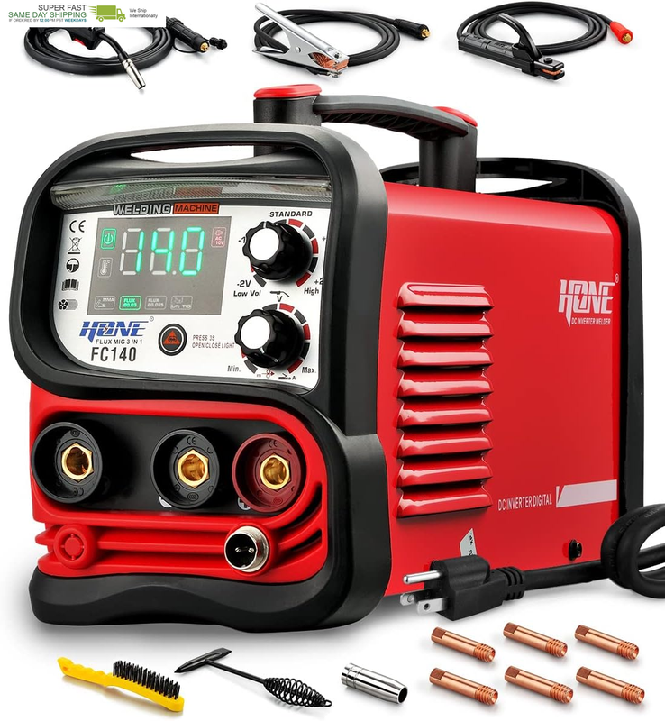 HONE MIG Welder 110V, Actual 140Amp Flux Core Welder/Stick Welder/Lift TIG 3 in 1 Synergic Welding Machine, Smart IGBT Inverter Large LED Display Gasless Wire Welder with Welding Gun