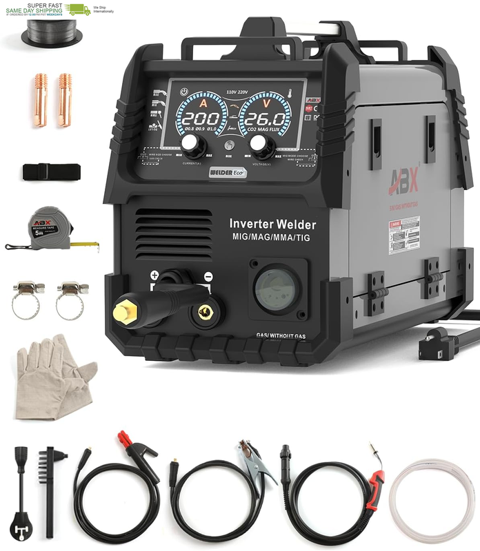 ABX MAG200A Welder, Welding Machine, 5 in 1 MMA Stick/Gas Mig/Mag/Gasless FLUX-CORED/LIFT Tig/Spot, 110V/220V Dual Voltage with Tape Measure, IGBT Inverter, Digital Screen Display