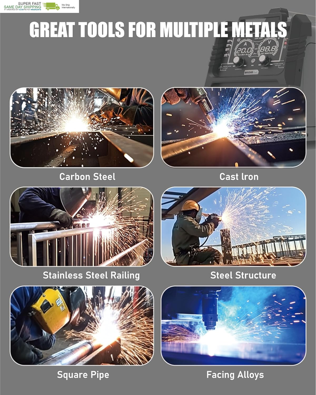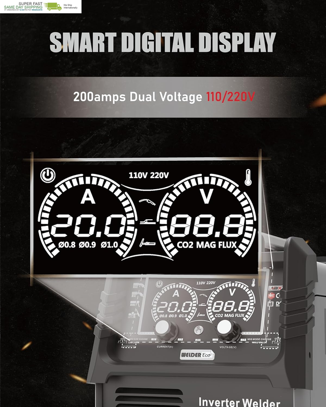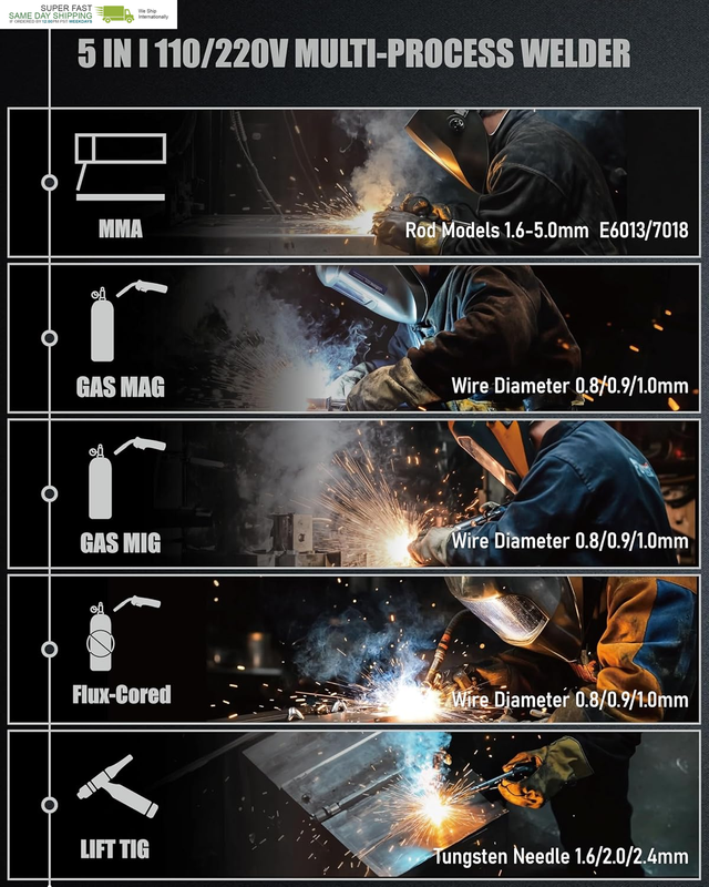 ?5-IN-1 WELDER?The MaG200 welder has multi-function for MMA Stick/GAS MIG /MAG/Gasless FLUX-CORED/LIFT TIG/Spot. Maximum current is 200 amps, supporting gasless flux-cored mig wire and solid mig wire, and can use 0.030" - 0.047"(0.8 - 1.2mm) flux core wire size, 0.023" - 0.039"(0.6 - 1.0mm) solid wire size, MMA Stick can use 6013/7018 welding rods. The flux core welder excels in welding stainless steel, carbon steel, and even thicker steel. This Multi MIG welder can weld various of metals. It can also weld stainless steel, alloy steel, iron. Meeting diverse welding needs