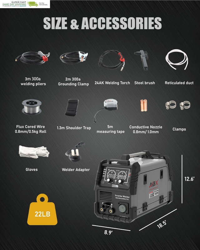 ?PORTABLE POWERFUL?The Mag Welder Weighs 22 Pounds, Mig Torch Is 9.84 Ft Long (Included Torch Head And Internal Wire Feed Length) And Comes With A Shoulder Strap For Easy Carrying And Outdoor Use. Package Includes: 1Mig 200 Mag Welder Machine, 13meters 300a Welding Tongs, 12meters 300a Grounding Clamp, 1Steel Brush, 11.3meters Shoulder Strap, 15 Meters Measuring Tape, 124ak 3meters Welding Torch, 1Gloves, 1Conductive Nozzle 0.8mm/1.0mm, 2Clamps, 1Anvil Tube, 1Welder Adapter, 1Flux Cored Wire 0.8mm/0.5kg Roll, 1Reticulated duct, 1 User Manual (Tig Gun And Spool Gun Not Included)
