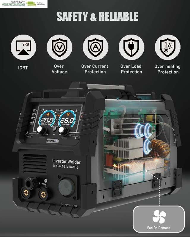 ?COLLABORATIVE CONTROL?The 5-in-1 welder adopts IGBT and integrated wire feeding technology to automatically match the recommended voltage and wire feeding speed (current). Let both beginners and professionals use it. Safety protection: The welder comes with a MIG welding gun and power cord, which can be welded after unpacking the box, and it is easy to use. Built-in overcurrent protection, overload protection, overheating and overvoltage functions can extend the service life of the machine. Note: Do not turn on the power until the screen is turned off and the fan stops