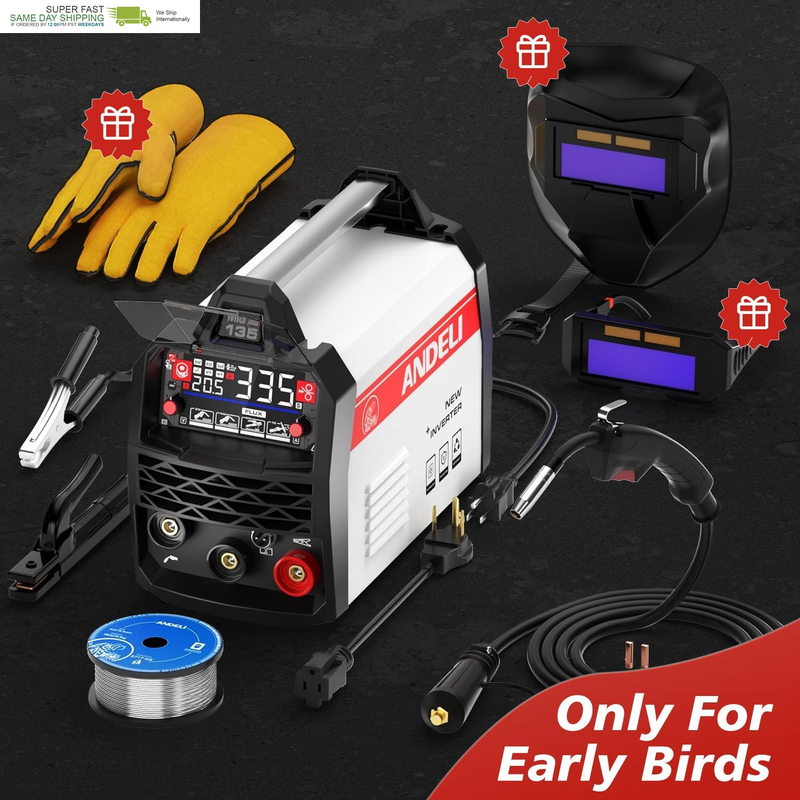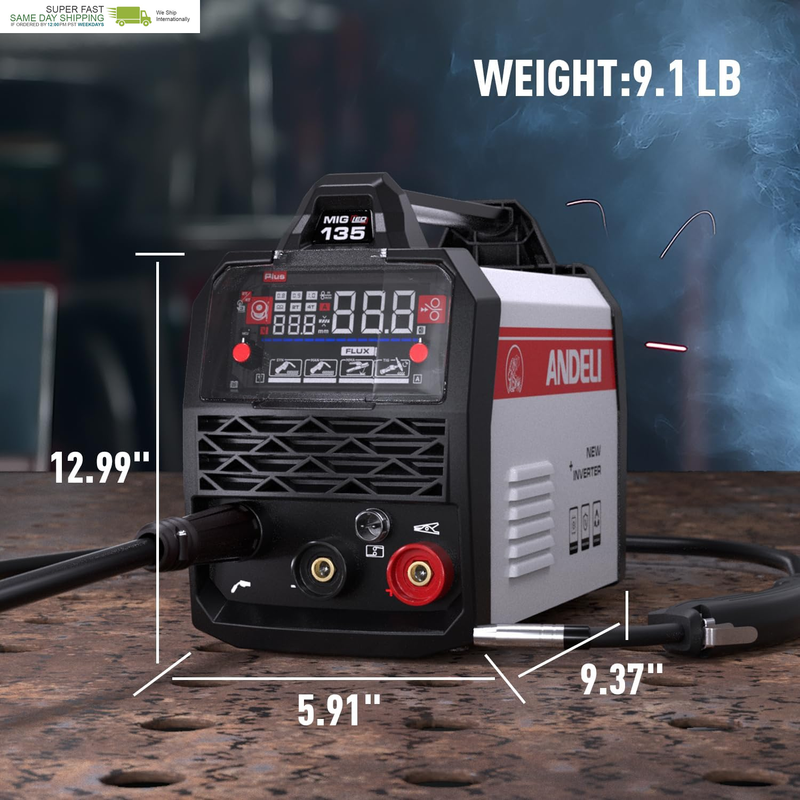 Ultra-Compact Package: The MIG-135 Plus welder boasts a space-saving, lightweight build (13? x 6? x 8?, weighs just 9 lbs) with unmatched power-supply flexibility. Ideal for tight spaces or on-the-go projects, its rugged yet portable frame ensures effortless workshop-to-job-site mobility. Package Includes: ANDELI MIG-135 Plus Welder*1, Electrode Holder(10ft)*1, Welding Torch (10ft)*1, Gasless Wire*1.