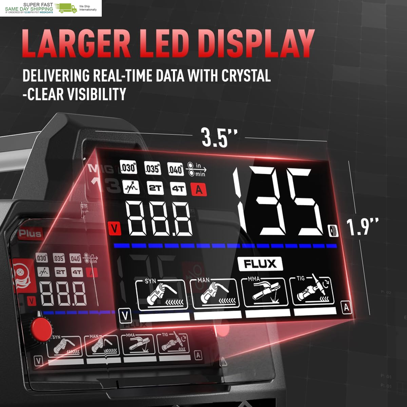 4.1-Inch Precision LED Display with Reinforced Protection: This 135A MIG welder features an oversized 4.1-inch LED screen for crystal-clear visibility, delivering real-time data with pinpoint accuracy?no need to remove your helmet mid-task. The MIG welder machine's transparent protection cover safeguards the welder machine's display against impacts, sparks, and debris, ensuring rugged durability and extended machine longevity for demanding workshop or job-site conditions.
