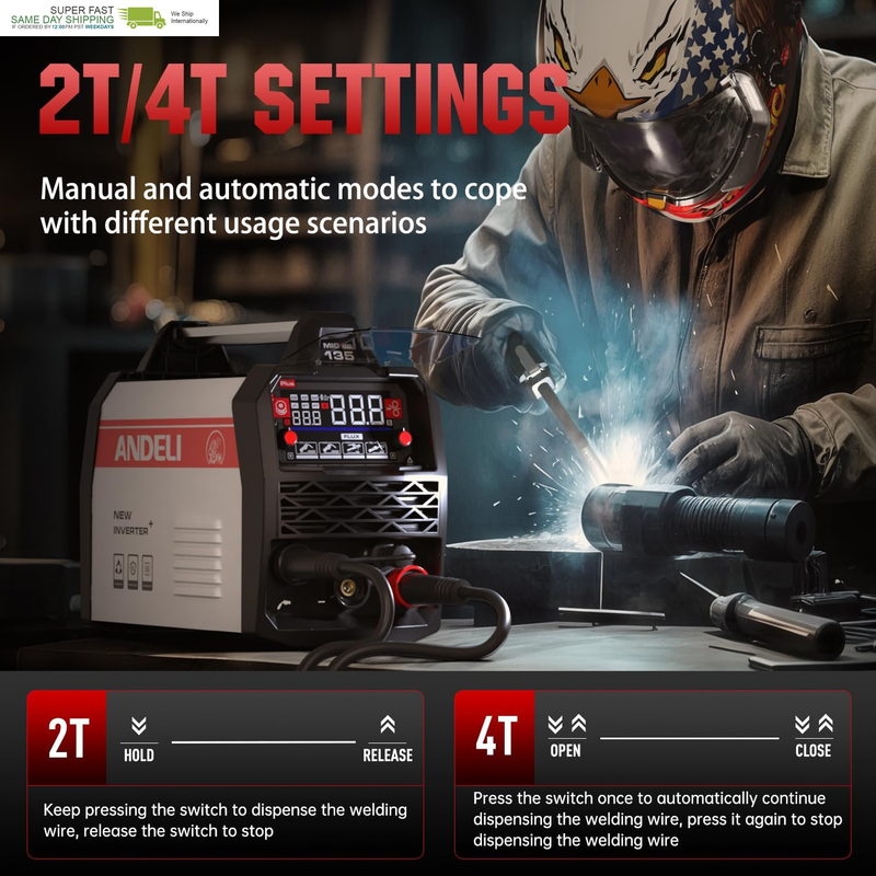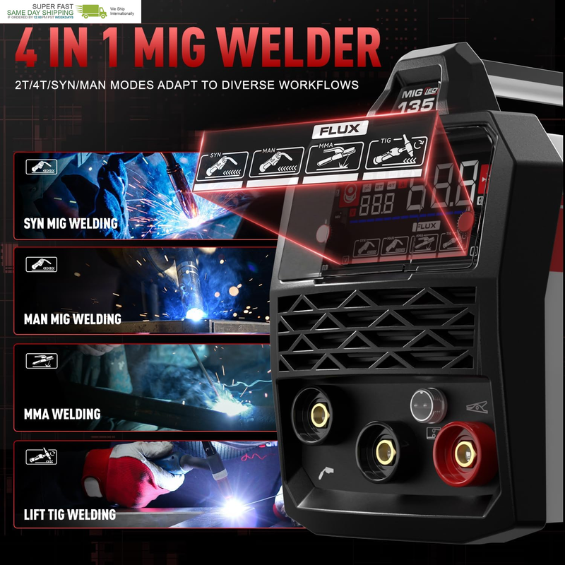 4-in-1 Versatile Welding Machine: This portable 135A MIG welder combines MAN Gasless MIG, SYN Gasless MIG, Lift TIG, and MMA Welding capabilities in one machine, catering to a wide range of welding needs (Lift TIG torch sold separately). Perfect for flux-cored welding on carbon steel, stainless steel, or thicker materials, this ANDELI 3-in 1 welder is an excellent choice for home DIY projects, outdoor repairs, rusty metal, farm equipment, road maintenance, and more.