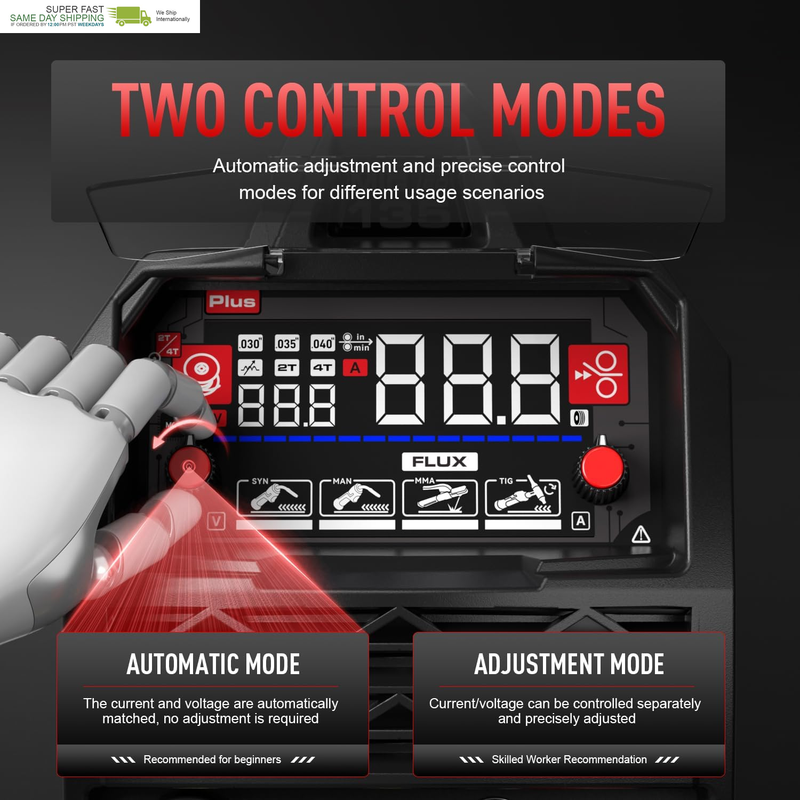 Smart Synergic Control Technology: Effortlessly adjust amperage or welding wire diameter, and the system of ANDELI welder instantly auto-optimizes voltage and wire feed speed for flawless results. Perfect for both novices and experts, this feature of ANDELI MIG welding machine eliminates guesswork, streamlines setup, and ensures precision across diverse projects.
