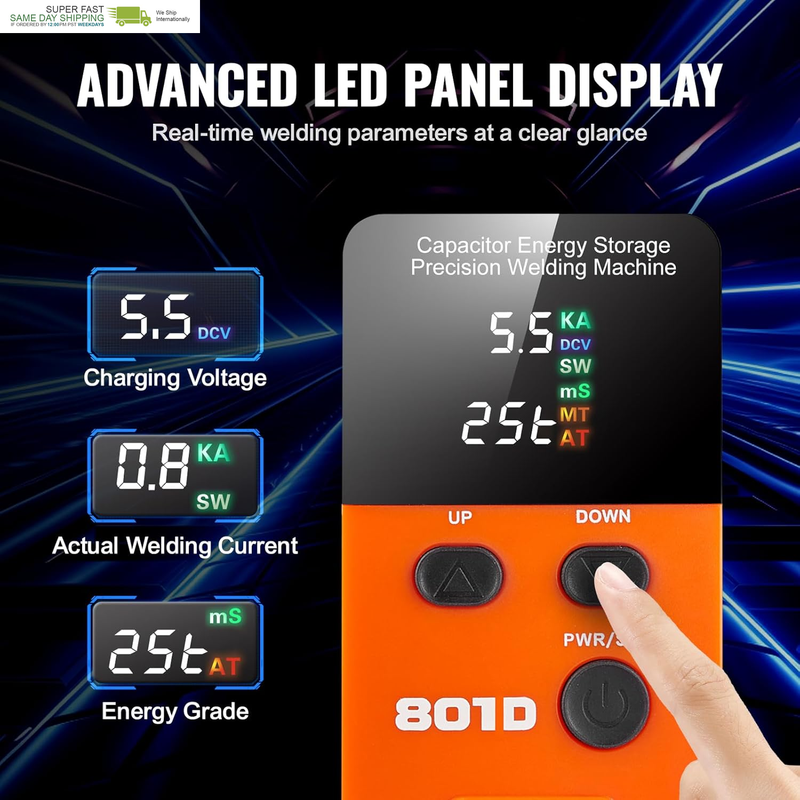 Intelligent LED Panel Display: Monitor real-time welding parameters effortlessly with our intuitive LED panel. From welding power to capacitor voltage and actual welding current, stay in control. Plus, you can easily adjust energy levels within the 1-99t range for fast spot welding and enhanced work efficiency.
