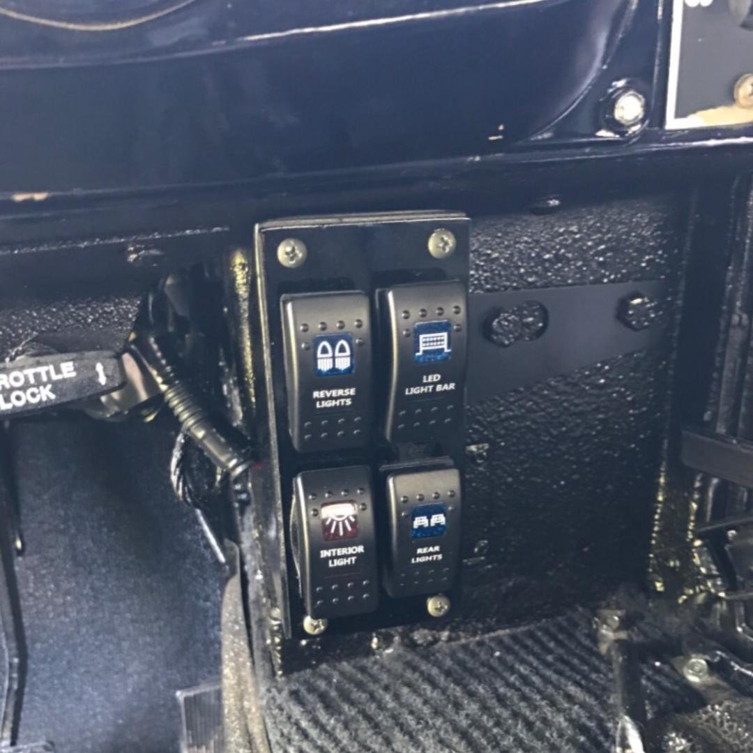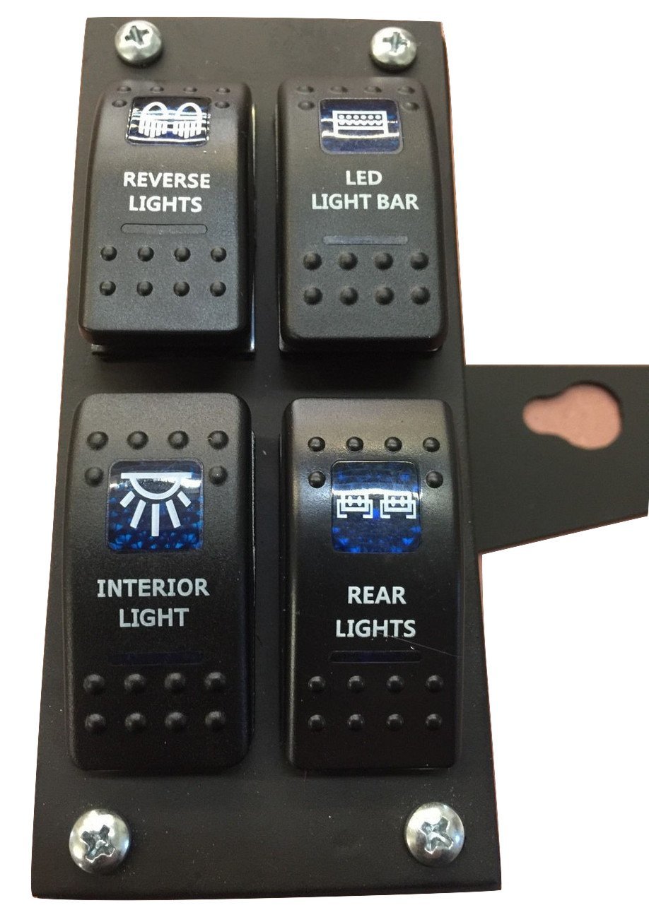 Product description: 4-gang rocker switch panel with 24v switches, Black, compatible with military humvee M998 HMMWV. No drilling required to mount! Rocker Switches: LED Light Bar, Cooling Fan, Rear Lights, Reverse lights, Interior, USB, Zombie Lights, Driving Lights, Spot Lights, Winch, Under Hood Light