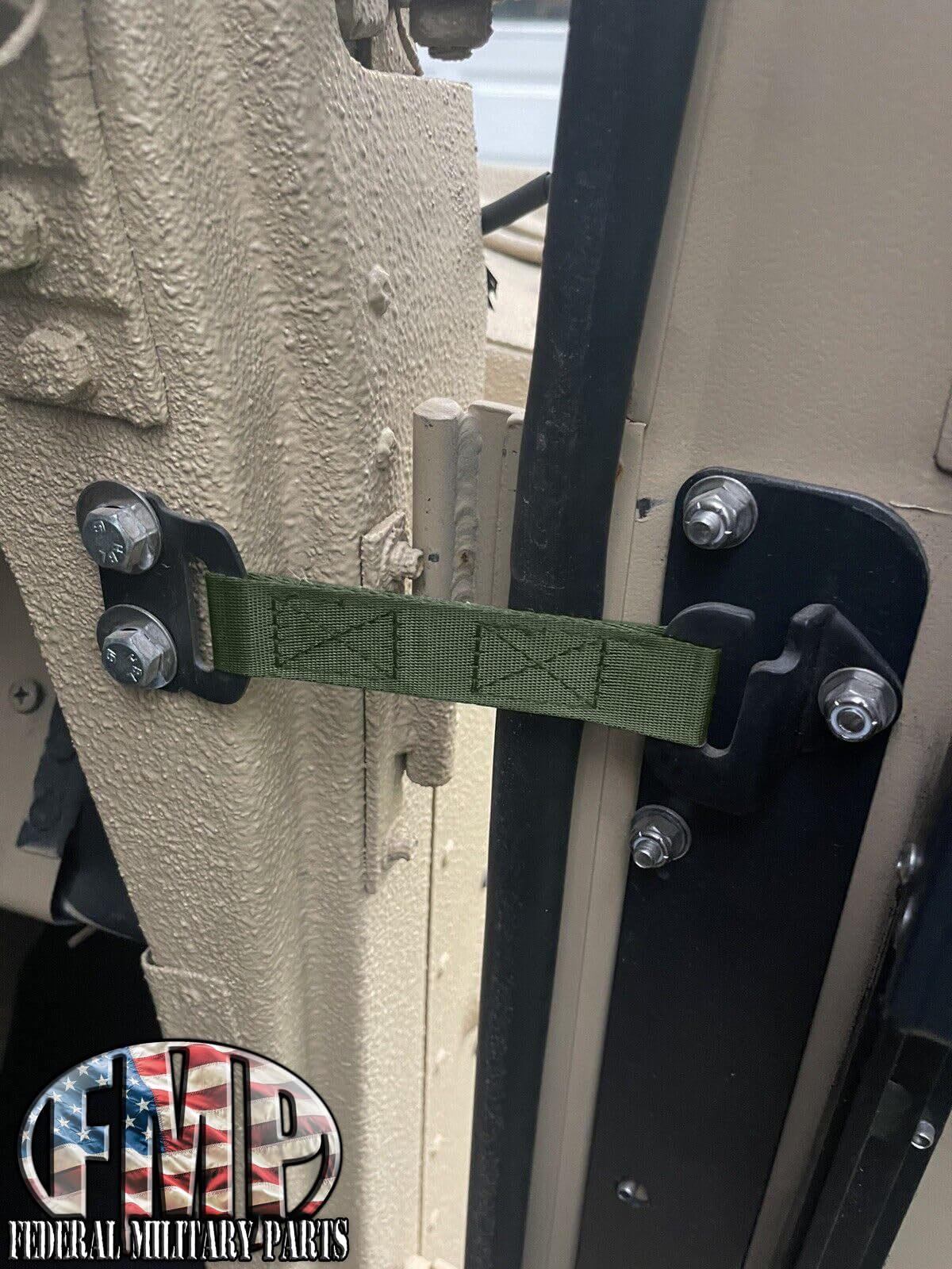 OEM NYLON WEBBING DOOR LIMITER STRAP. THIS ONE IS GREEN. NSN 5340-01-255-9918, 5340012559918