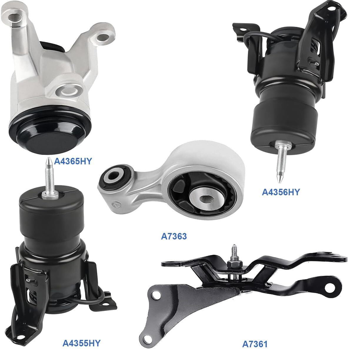 Compatible Vehicles: Motor mount set fit for Nissan Altima V6 3.5L auto CVT trans 2007-2012, for Maxima V6 3.5L 2009-2014 OEM: A4355HY, 9808, 112709N00A, 112709N00B; A4356HY, 9807, 113209N00A; A4365HY, 9622, 112103KA0A, 112109N00A; A7361, 9460, 112209N00A, 11220JA10A; A7363, 9545, 113509N00A, 11350JP00B Mounting Positions: A4355HY: Front motor mount, A4356HY: Rear motor mount, A4365HY: Front right motor mount, A7361: Transmission mount, A7363: Front right torque strut mount Smooth Driving: Replacing old and damaged engine mounts and gearboxes can improve driving comfort and safety, say goodbye to vibration and noise, and make your car drive quiet and smooth Note: Please use the vehicle finder at the top to check if this product is compatible with your car