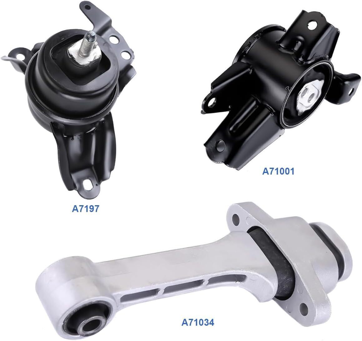 Compatible Vehicles: Motor mount set fit for Kia Optima EX L4 2.4L 2011-2015, for Optima EX Luxury L4 2.4L 2013-2015, for Optima LX L4 2.4L 2011-2015, for Optima SX L4 2.4L 2014-2015. OEM: A7197, 9755, 218302T150, 218303Q750; A71001, 9766, 218102T200, 218102T000, 218103S600; A71034, 9760, 219502S000. Mounting Positions: A71001: Front motor mount, A71034: Front lower motor mount, A7197: Transmission mount. Smooth Driving: Replacing old and damaged engine mounts and gearboxes can improve driving comfort and safety, say goodbye to vibration and noise, and make your car drive quiet and smooth. Note: Please check if this product is compatible with your car, if you have any questions, please feel free to contact us, we will reply within 24 hours.