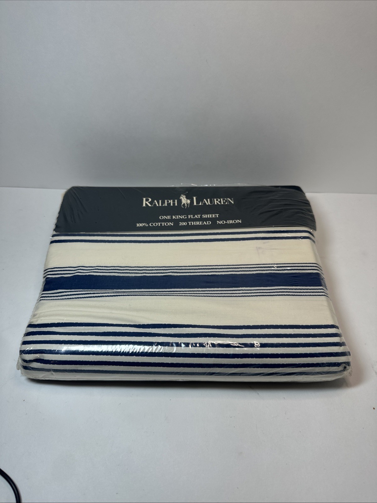 Ralph Lauren One King Flat Sheet Luke Border Blue 100% Cotton 200 Thread (R)