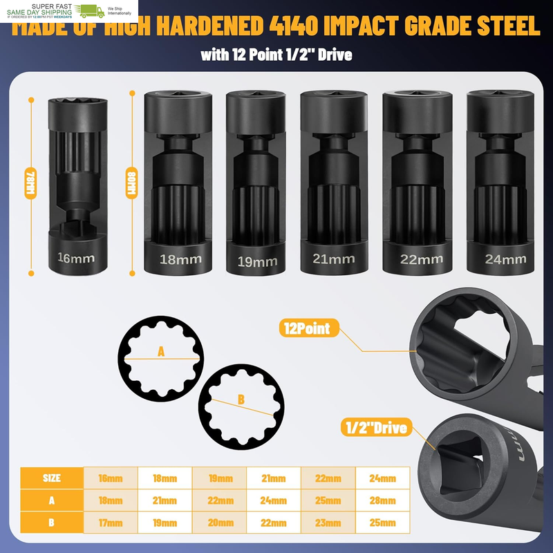 More comprehensive tool combination: This is a complete shock absorber removal kit, the strut nut removal tool kit includes 16mm, 18mm, 19mm, 21mm, 22mm, 24mm strut nut sockets (12-point design with 1/2" square drive slot, 3.1 inches in length), 2 different sizes of strut expander sockets (socket head size: 5*8mm and 4.5*6.5mm) and a universal strut expander tool (expansion range: 5.0-11.5 mm, outer hexagon: 17mm).