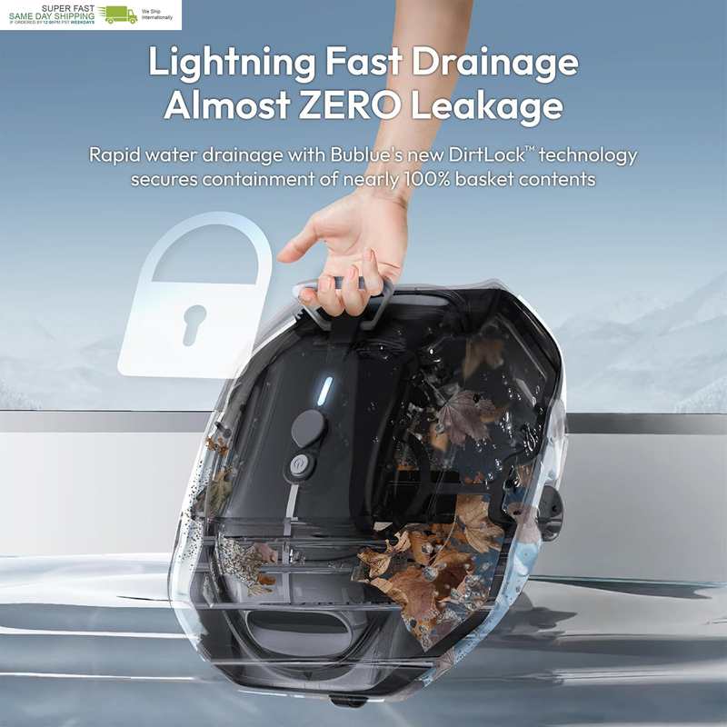 Leak-Free Cleanup with DirtLock Tech 2.0: Forget the hassle of leaks! Our upgraded DirtLock Tech 2.0 securely contains all debris, leaves, and fine sand for a completely worry-free cleanup. Lift the Bubot 300P out of the water, and in just 5 seconds, it drains all stored water with ZERO leakage, making your pool maintenance easier than ever.