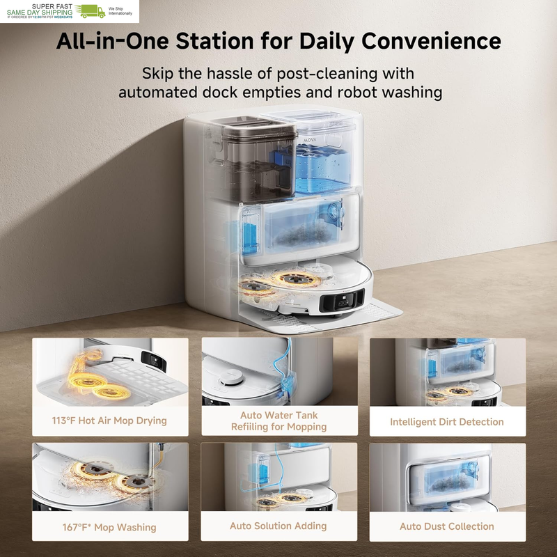 Fully Automated Cleaning: Get a comprehensive cleaning experience with the fully self-maintaining robot vacuum and mop combo. Its auto-sufficient dock collects dust for up to 75 days, cleans mop pads with 75? (167?) hot water, adds water and solution and dries the mops to prevent the spread of foul odors.