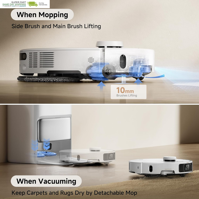 Dry Carpets, Clean Floors: Relish thorough debris removal without getting stuck in messes. With a side brush, main brush, and mop lifting, the robot vacuum handles spills and crumbs with no mess crossover from carpets to floors. A removable mop keeps carpets dry and pristine, ensuring advanced carpet care.