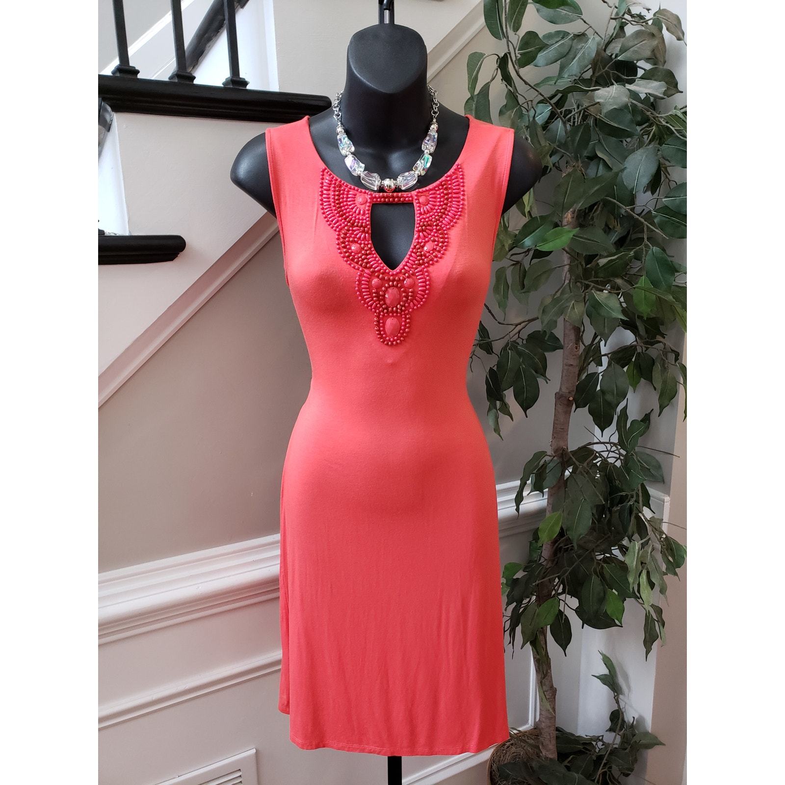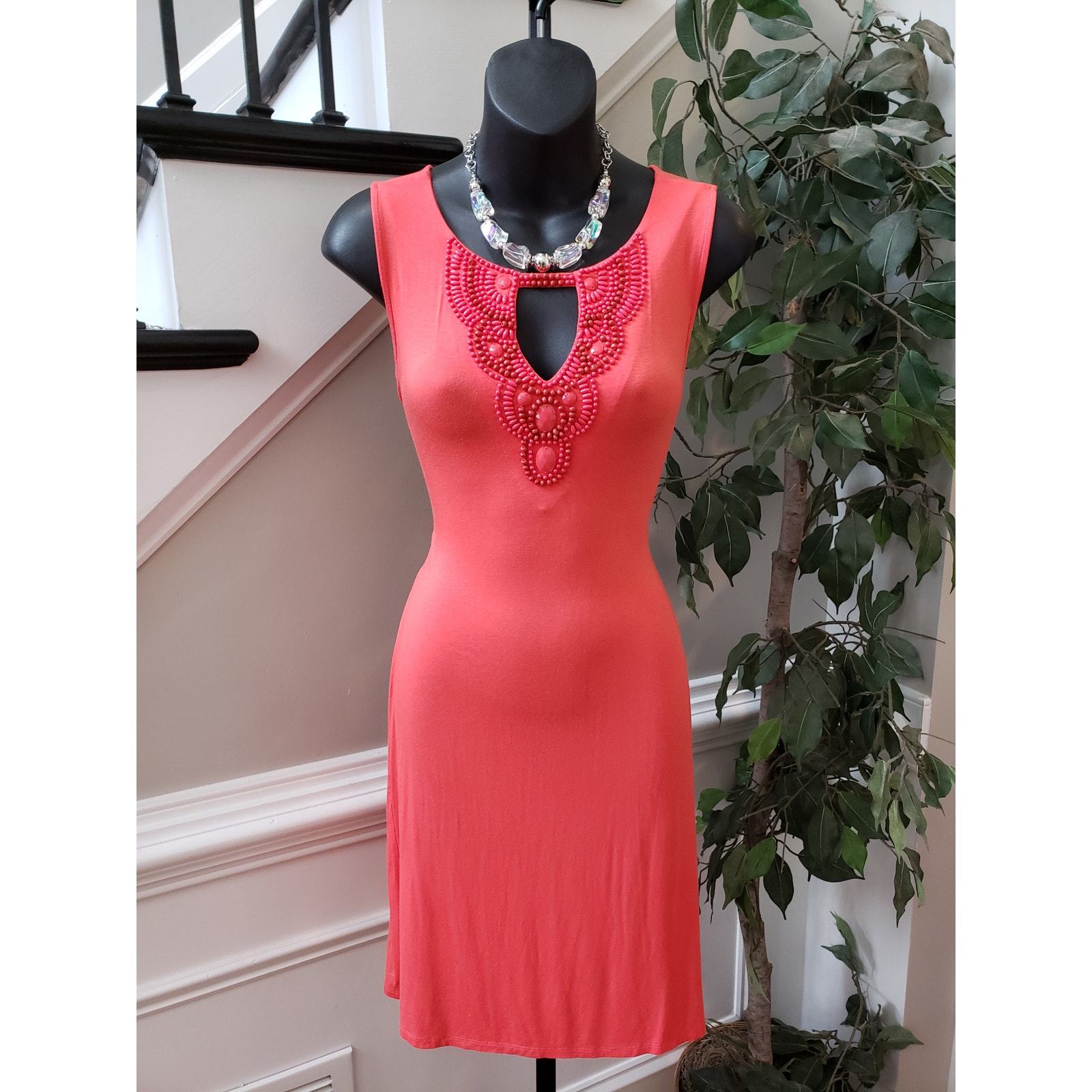 Elevate your summer wardrobe with this stunning Dana Buchman coral pink dress in size Small. Featuring a sleeveless design, keyhole neckline, and eye-catching beaded embellishment, this stretchy and flattering piece is perfect for daytime events or evening outings. Soft rayon blend ensures comfort and a smooth fit.