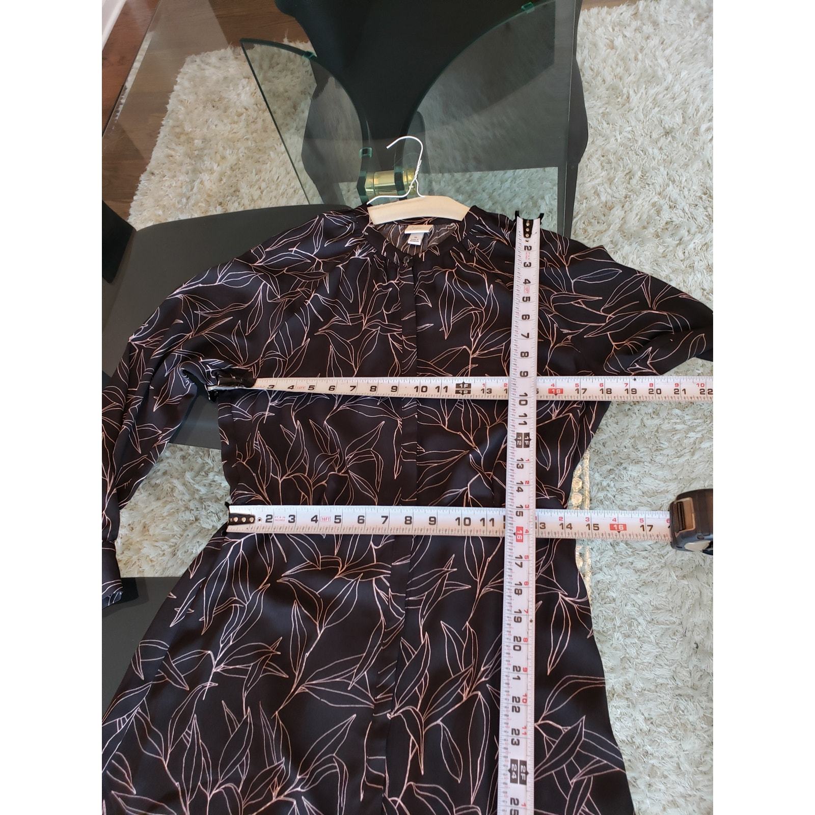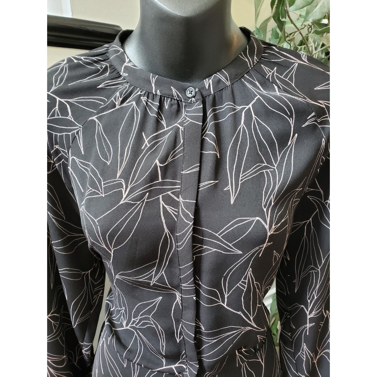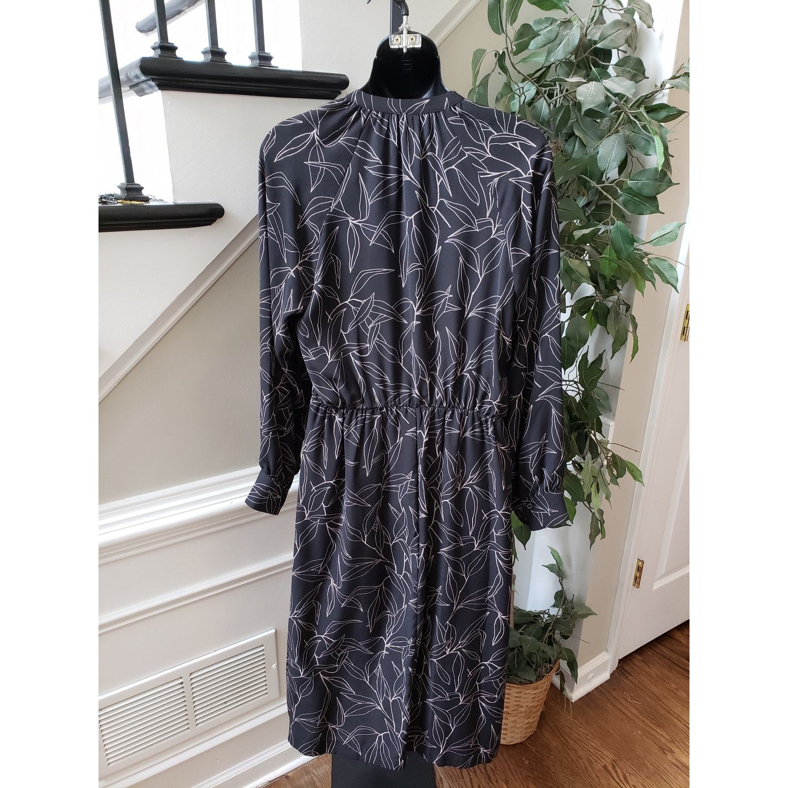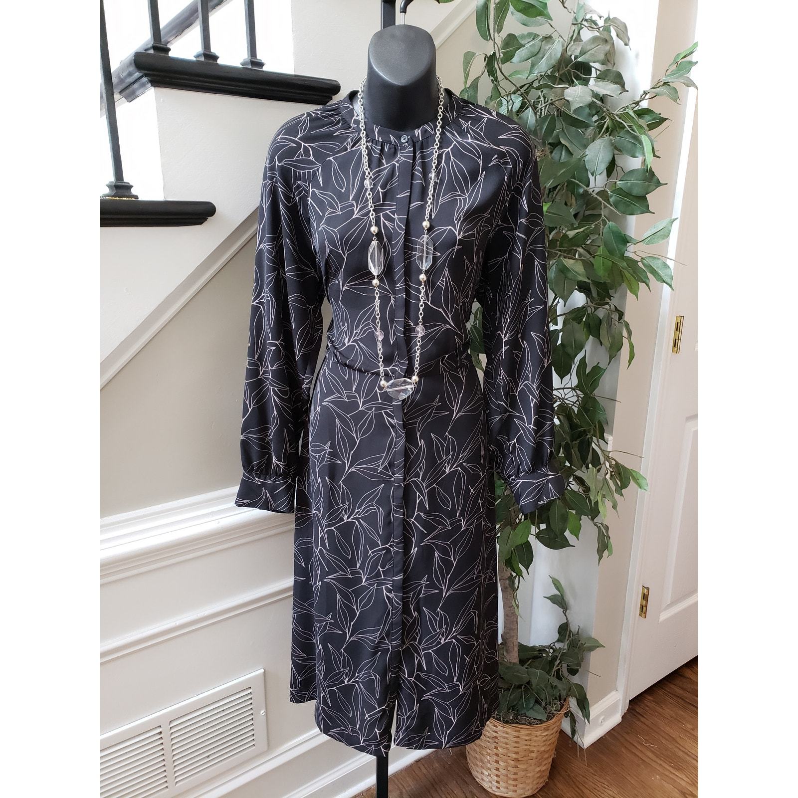 A New Day Shirt Dress Women M Black White Leaf Print Long Sleeve Button Casual