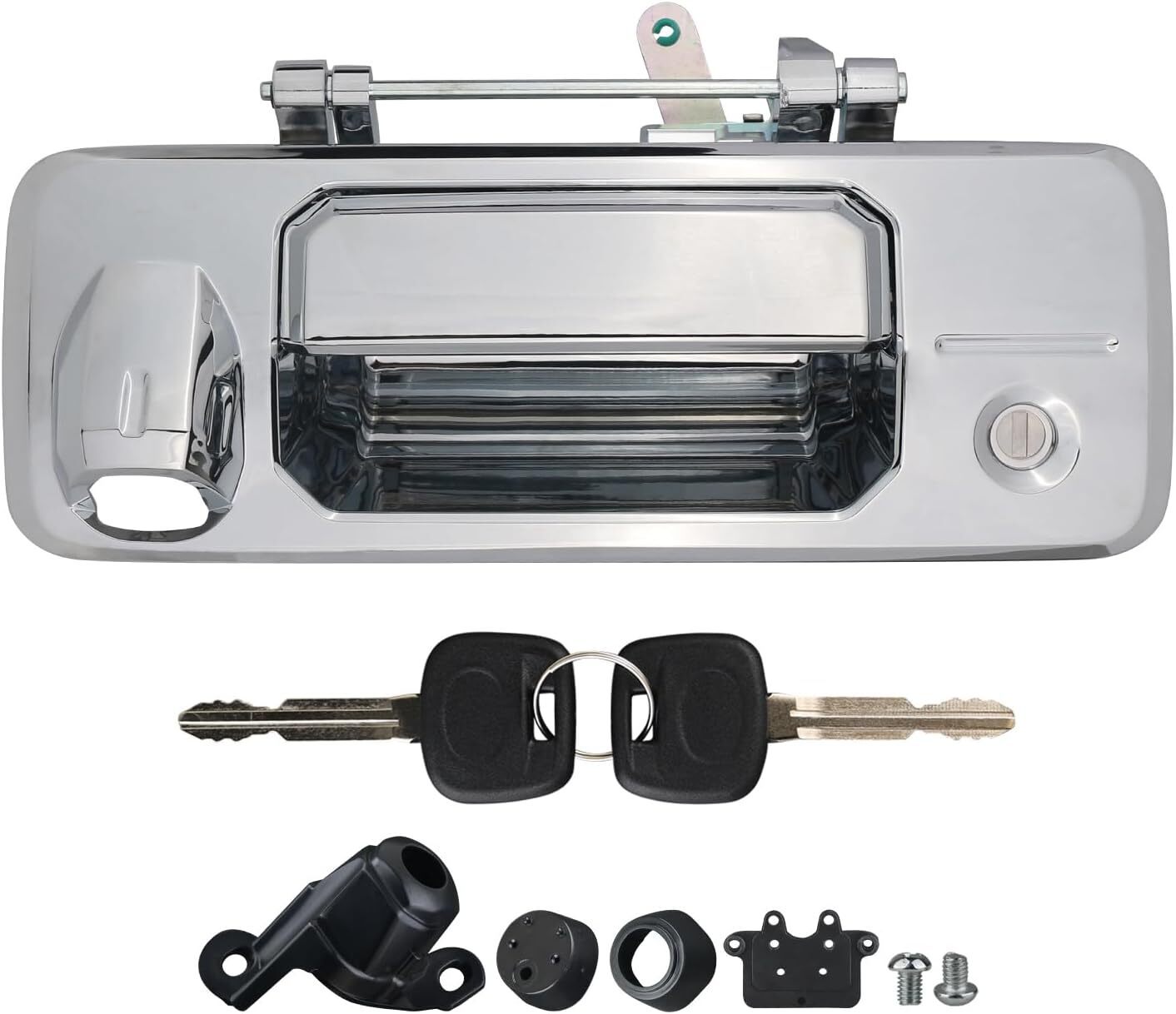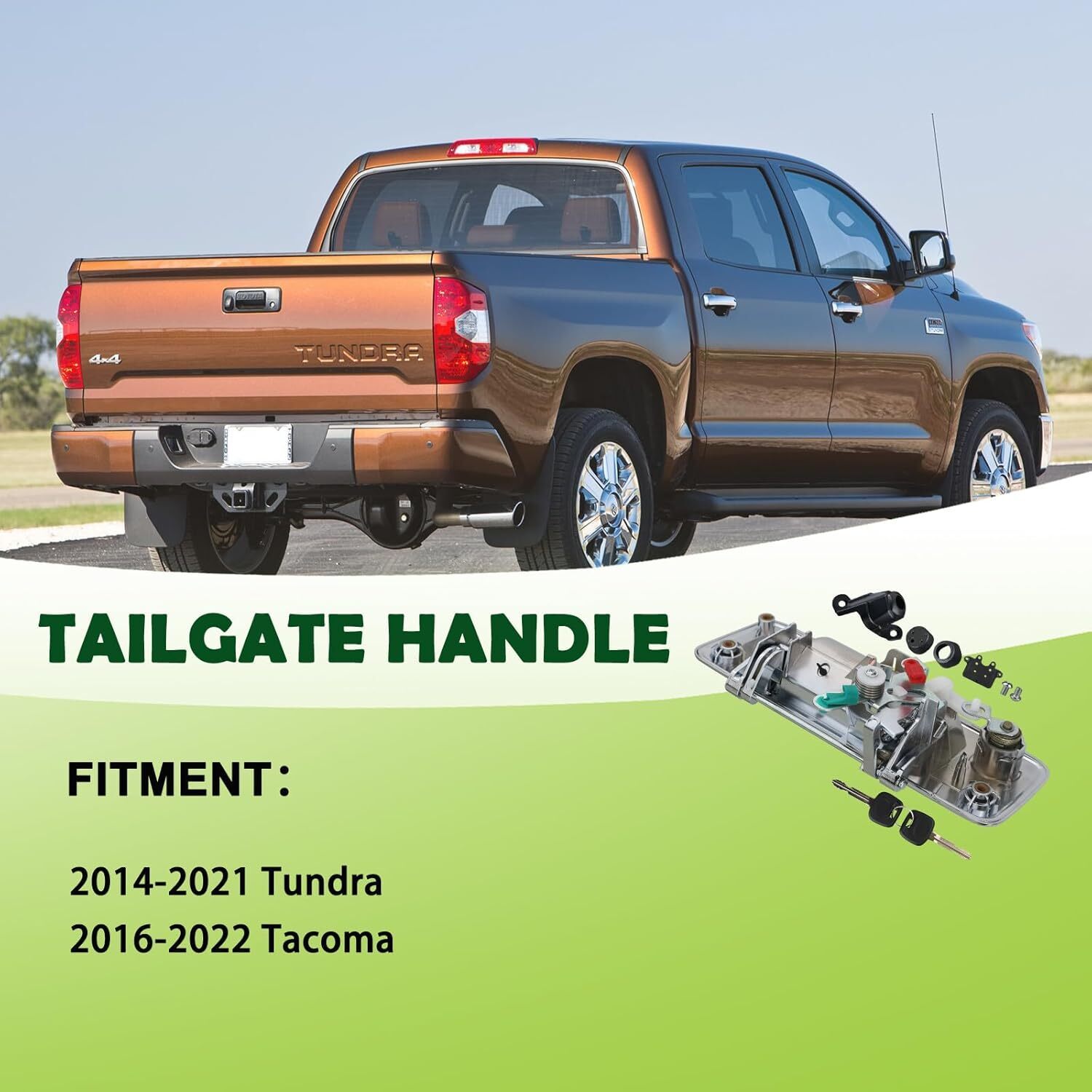 REPLACEMENT PART NUMBER: 69090-0C090 690900C090 69090-0C091 690900C091 COMPATIBLE WITH: The tailgate door handle with rear camera hole compatible with 2014 2015 2016 2017 2018 2019 2020 2021 14 15 16 17 18 19 20 21 Toyota Tundra,2016 2017 2018 2019 2020 2021 2022 16 17 18 19 20 21 22 Toyota Tacoma,Please refer to the vehicle compatibility above to ensure proper part FEATURES:The rear latch handle with key lock cylinder with upgraded chrome plating process plastic and high-quality metal , high hardness,oxidation resistance,heat resistance,corrosion resistance,replacement of new parts and car perfect fit,Solve your safety problems while making your car look new and more beautiful SERVICE LIFE EASY INSTALLATION:This chrome tailgate latch handle is not the real original parts,but it uses advanced technology and high-quality materials in line with oem standards, more effective extension of service life,and easy to install,Directly replace the liftgate latch handle,so that the tail gate to restore normal work,can save you time and money BUY WITH CONFIDENCE: 1-Year Warranty.If you have any questions or concerns about the exterior Liftgate handle with lock cylinder and 2 keys,please contact us by email and we will provide you with satisfactory service support