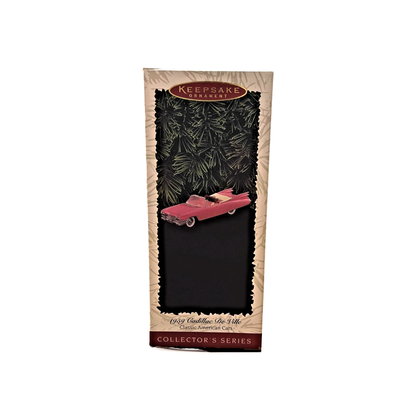 The 1969 Hallmark 1959 Pink Cadillac De Ville Keepsake Ornament is a vintage collectible featuring a classic car design. This ornament, part of the Hallmark franchise, is the perfect addition to any holiday decor with its pink color and Christmas theme. Made of mixed materials, this original piece from 1996 includes a hanging feature and comes boxed, making it a charming addition to any ornament collection.