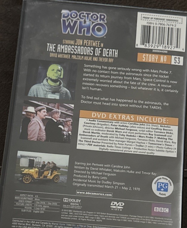 The product is a brand new 2-disc DVD set of Doctor Who: Episode 53 - Ambassadors of Death. Released in 2012, this sci-fi and fantasy TV show set in the Doctor Who universe offers thrilling and adventurous episodes. With a rating of NR, this DVD set is a must-have for fans of the popular TV series. Experience the exciting storyline and captivating performances in the comfort of your own home with this exciting DVD release.