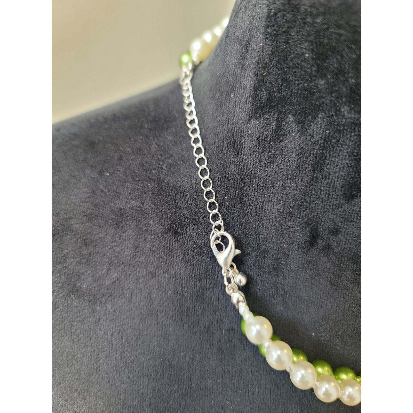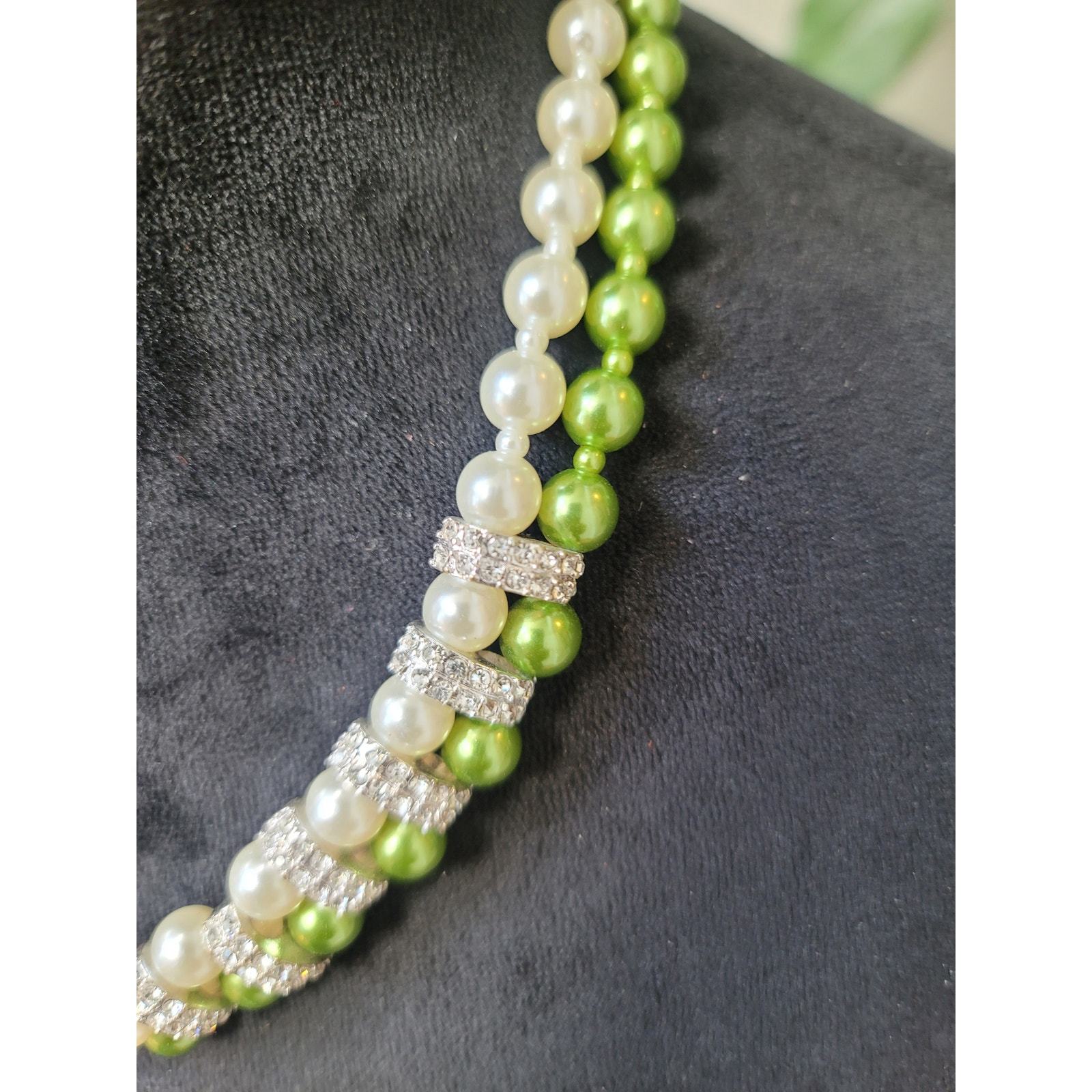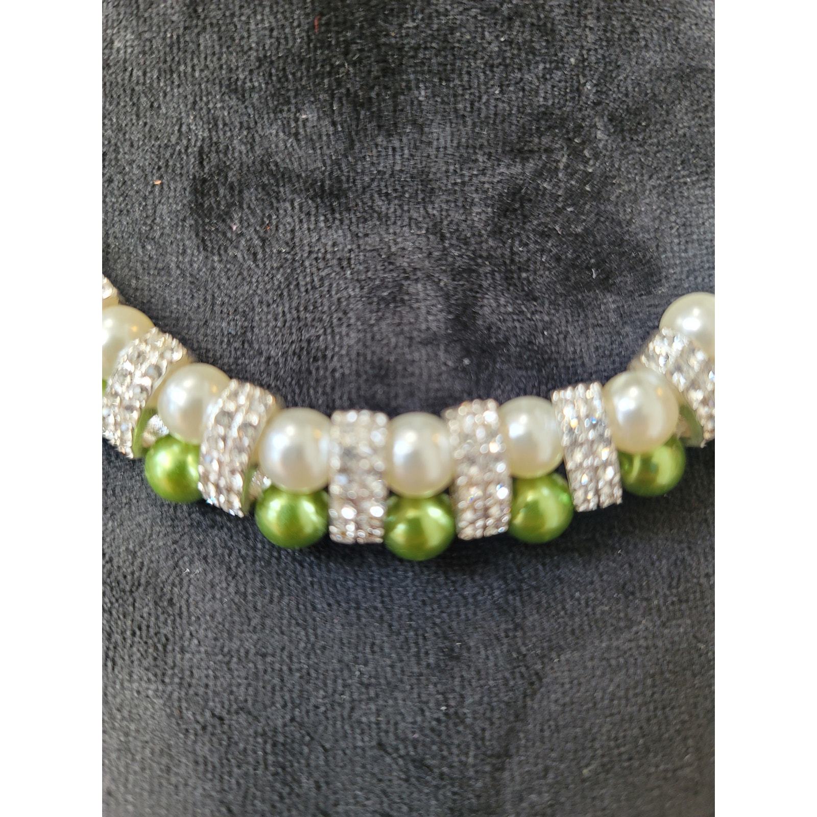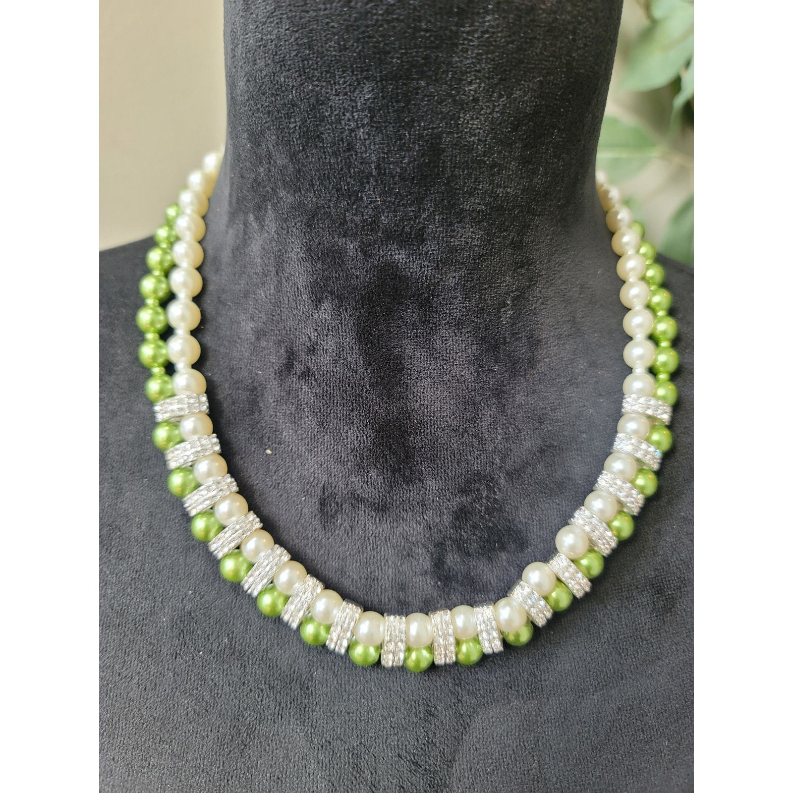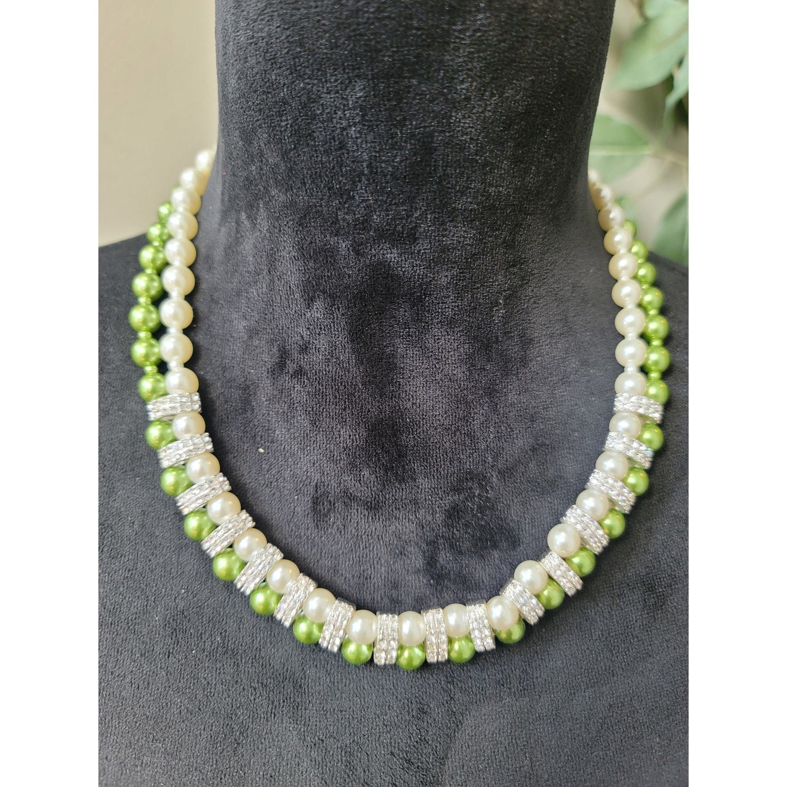 Women's Green And White Pearl Necklace With Rhinestone Spacers Lobster Lock