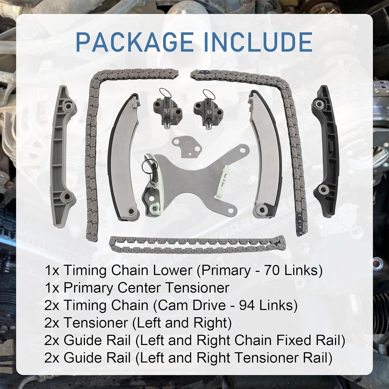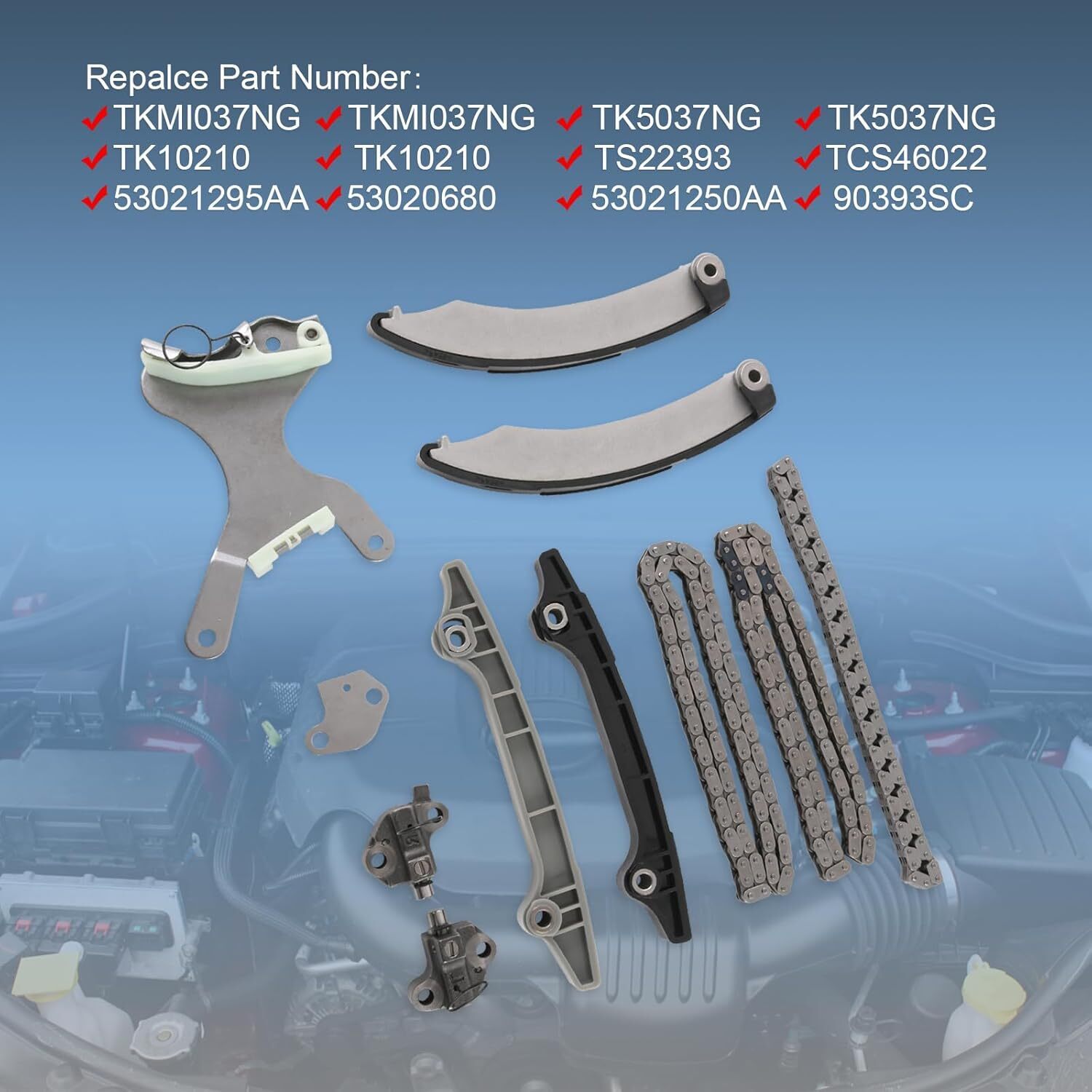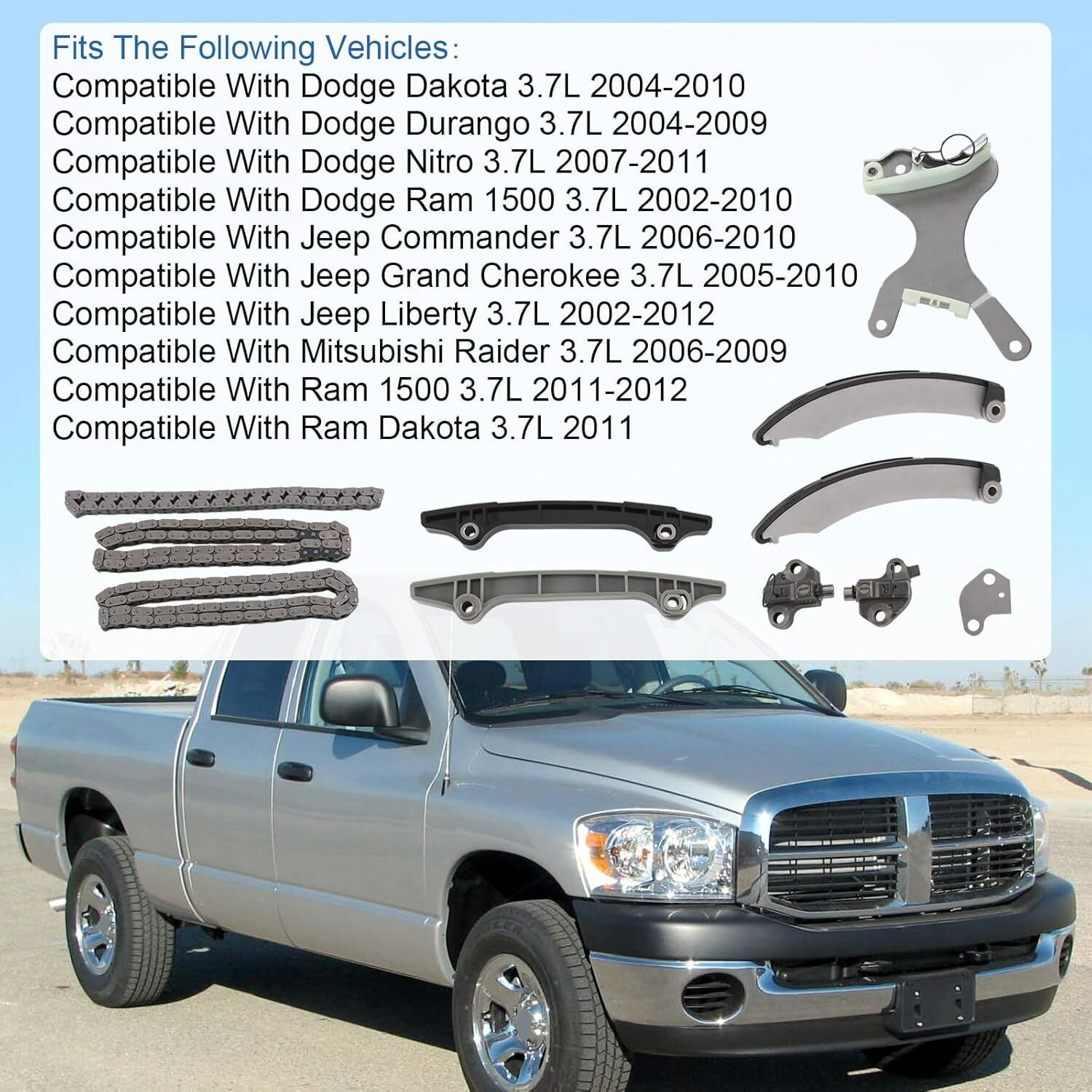[COMPATIBLE WITH] Compatible with Dodge Dakota 2004-2010 3.7L, compatible with Dodge Durango 2004-2009 3.7L, compatible with Dodge Nitro 2007-2011 3.7L, compatible with Dodge Ram 1500 2002-2010 3.7L, compatible with Jeep Commander 2006-2010 3.7L, compatible with Jeep Grand Cherokee 2005-2010 3.7L, compatible with Jeep Liberty 2002-2012 3.7L, compatible with Mitsubishi Raider 2006-2009 3.7L, compatible with Ram 1500 2011-2012 3.7L, compatible with Ram Dakota 2011 3.7L. [REPLACE PART NUMBER] TKMI037NG, TK10210, TK5037NG, 90393SC, TS22393, TCS46022, 53021295AA, 53020680, TKMI037NG, TK10210, TK5037NG, 53021250AA. Please check the part number and fitment before placing order. [FUNCTION] The timing chain is an important part of the engine valve system, maintains this synchronization between the crank and camshaft as it transmits the rotation of the crankshaft to the camshaft. When the timing chain fails, it will damage the engine. After replacing the new timing chain, the engine noise will be reduced to ensure the engine life. [FEATURE] It is a direct replacement for the factory replacement timing chain kit. It is precision-engineered to match the fit and function of the original timing chain kit. ensure a long service life and has undergone on-vehicle testing to ensure proper fit and performance. [PACKAGE INCLUDE] 1x Timing Chain Lower (Primary - 70 Links), 2x Timing Chain (Cam Drive - 94 Links), 1x Primary Center Tensioner, 2x Tensioner (Left and Right), 2x Guide Rail (Left and Right Chain Fixed Rail), 2x Guide Rail (Left and Right Tensioner Rail).