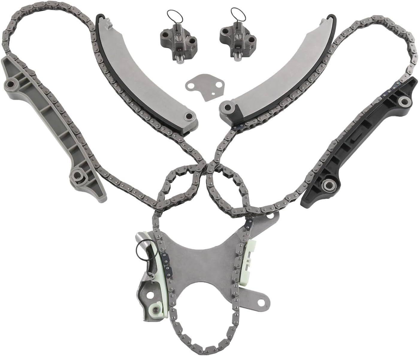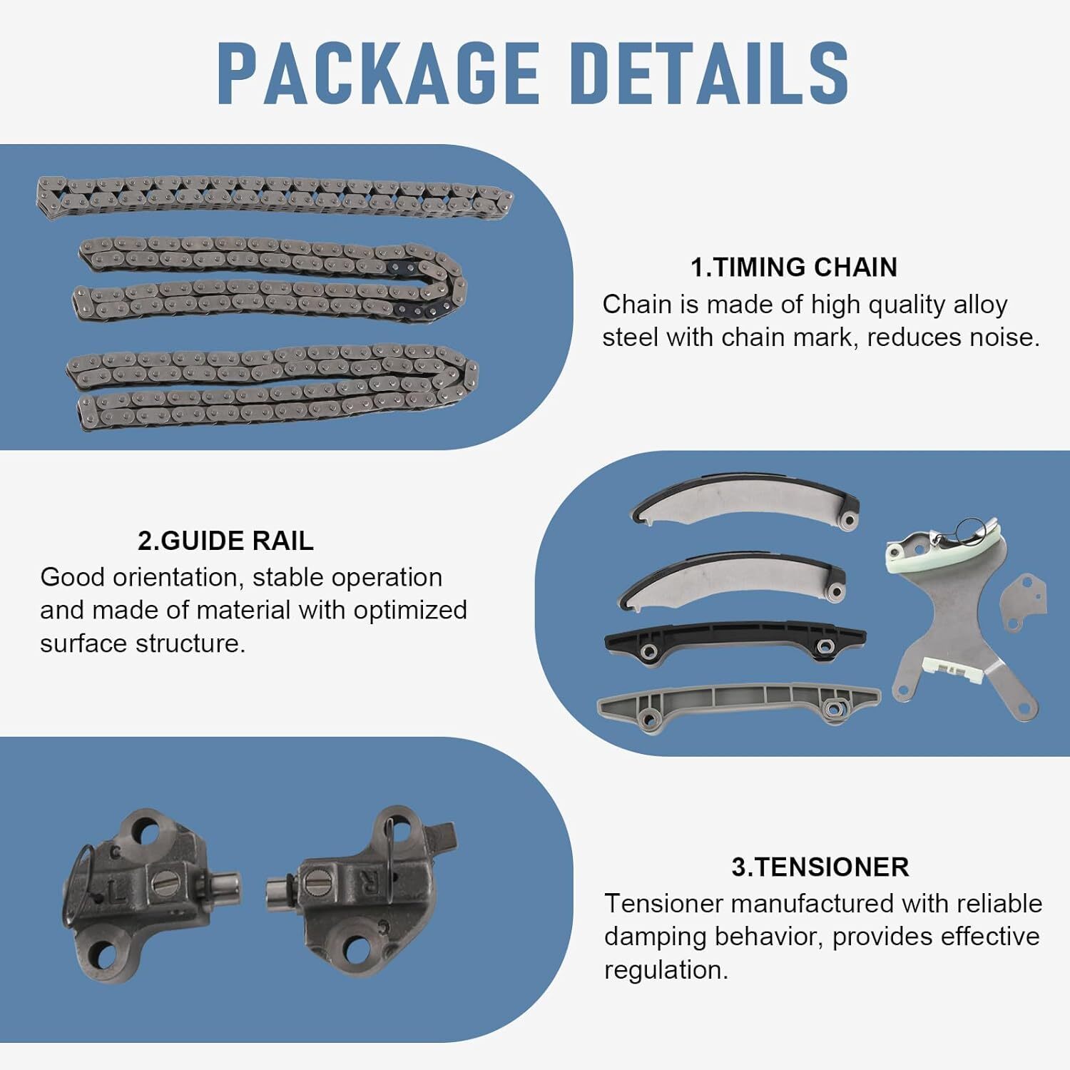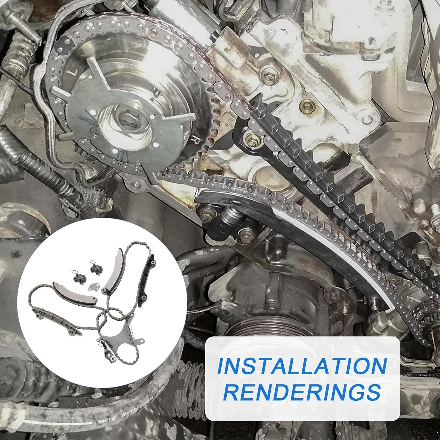 [COMPATIBLE WITH] Compatible with Dodge Dakota 2004-2010 3.7L, compatible with Dodge Durango 2004-2009 3.7L, compatible with Dodge Nitro 2007-2011 3.7L, compatible with Dodge Ram 1500 2002-2010 3.7L, compatible with Jeep Commander 2006-2010 3.7L, compatible with Jeep Grand Cherokee 2005-2010 3.7L, compatible with Jeep Liberty 2002-2012 3.7L, compatible with Mitsubishi Raider 2006-2009 3.7L, compatible with Ram 1500 2011-2012 3.7L, compatible with Ram Dakota 2011 3.7L. [REPLACE PART NUMBER] TKMI037NG, TK10210, TK5037NG, 90393SC, TS22393, TCS46022, 53021295AA, 53020680, TKMI037NG, TK10210, TK5037NG, 53021250AA. Please check the part number and fitment before placing order. [FUNCTION] The timing chain is an important part of the engine valve system, maintains this synchronization between the crank and camshaft as it transmits the rotation of the crankshaft to the camshaft. When the timing chain fails, it will damage the engine. After replacing the new timing chain, the engine noise will be reduced to ensure the engine life. [FEATURE] It is a direct replacement for the factory replacement timing chain kit. It is precision-engineered to match the fit and function of the original timing chain kit. ensure a long service life and has undergone on-vehicle testing to ensure proper fit and performance. [PACKAGE INCLUDE] 1x Timing Chain Lower (Primary - 70 Links), 2x Timing Chain (Cam Drive - 94 Links), 1x Primary Center Tensioner, 2x Tensioner (Left and Right), 2x Guide Rail (Left and Right Chain Fixed Rail), 2x Guide Rail (Left and Right Tensioner Rail).