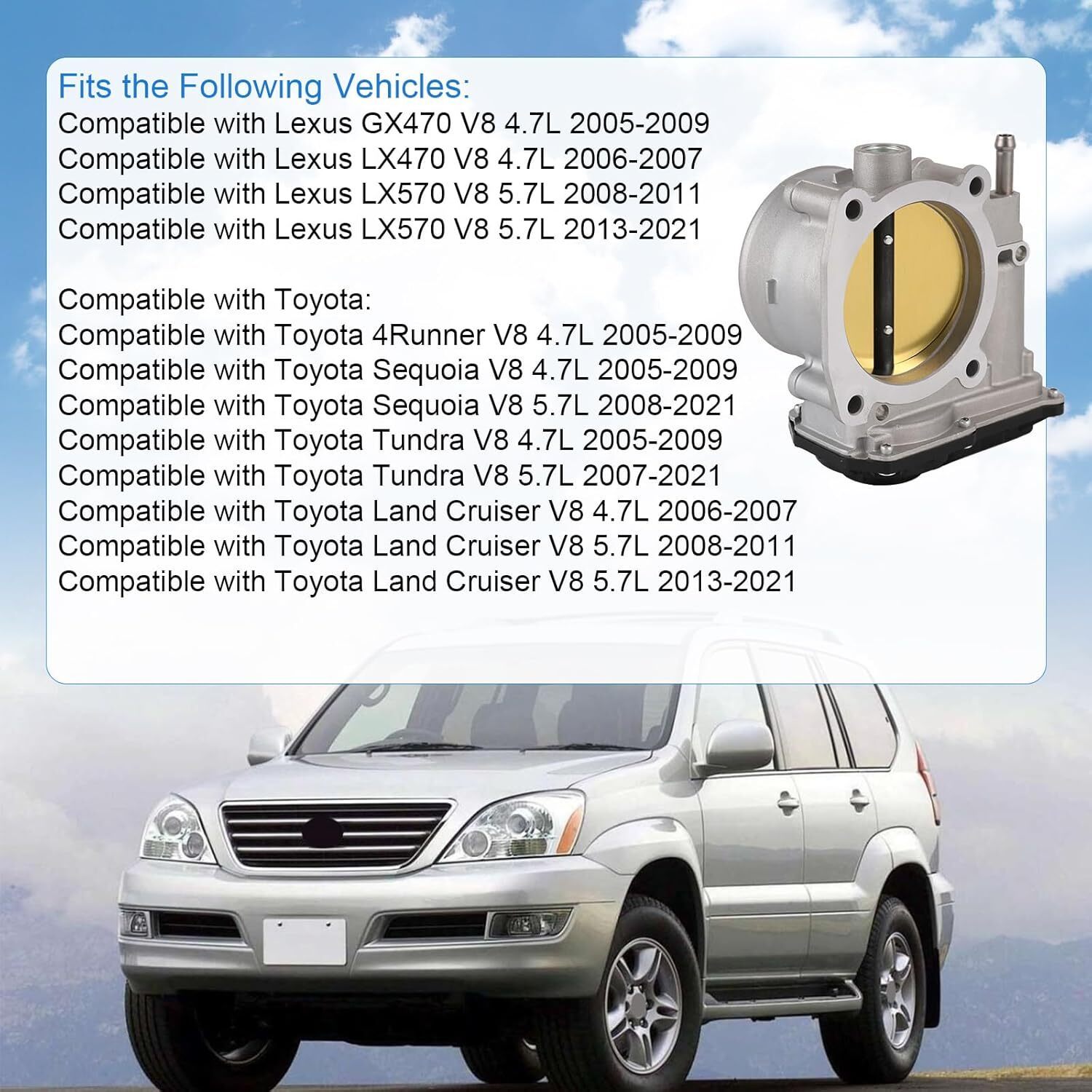 [COMPATIBLE WITH] Compatible with Lexus GX470 V8 4.7L 2005-2009, compatible with Lexus LX470 V8 4.7L 2006-2007, compatible with Lexus LX570 V8 5.7L 2008-2011 2013-2021. Compatible with Toyota 4Runner V8 4.7L 2005-2009, compatible with Toyota Land Cruiser V8 4.7L 2006-2007, compatible with Toyota Land Cruiser V8 5.7L 2008-2011 2013-2021, compatible with Toyota Sequoia V8 4.7L 2005-2009/5.7L 2008-2021, compatible with Toyota Tundra V8 4.7L 2005-2009/5.7L 2007-2021. [REPLACE PART NUMBER] 22030-0F010, 22030-0S010, 22030-38020, 22030-50200, 220300F010, 220300S010, 2203038020, 2203050200, TB1218, TB1153, S20197, 67-8007, 6E-8007, 977-805. Please check the part number and fitment before placing order. [QUALITY ASSURANCE] High quality and rigorous testing. This throttle body is made of high quality material for high precision and durability. And it had undergone rigorous testing and inspecting to ensure all performance parameters meet the standard, ensure long time to use. [FIT] Upgrade critical component parts include the housing, throttle plate, position sensors and throttle actuator motor meet or exceed the standard. It is comparable in fit, form and function to the original part, ensures proper fit and performance. [EASY TO INSTALL] This electronic throttle body can be easy to install. Throttle actuator, idle air control and throttle position sensor are pre-assembled in each unit, directly plugs into the original equipment wiring harness with no adapter required, which save much time.