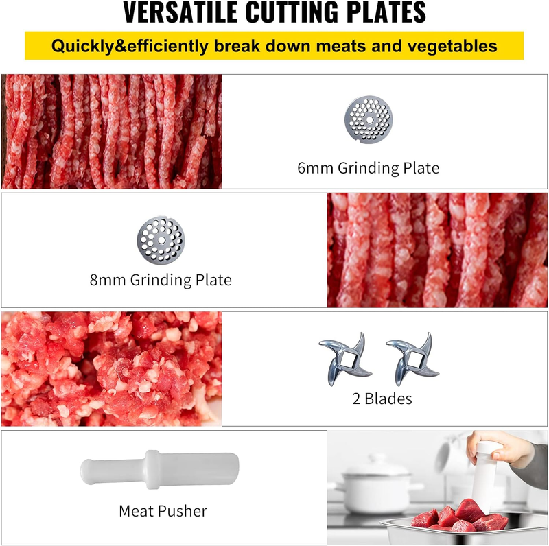 Our electric meat grinder is a fast, convenient way to make perfect ground meat. Constructed of the food-grade stainless steel material, healthy and durable to use. With the 1100W motor, it can grind the meat up to 550lbs per hour. The simple operation effectively saves time and energy. Two grinding plates(6 mm,8 mm) supplied for the coarse or fine grinding. Suitable for various situations including kitchens, restaurants, and company use.