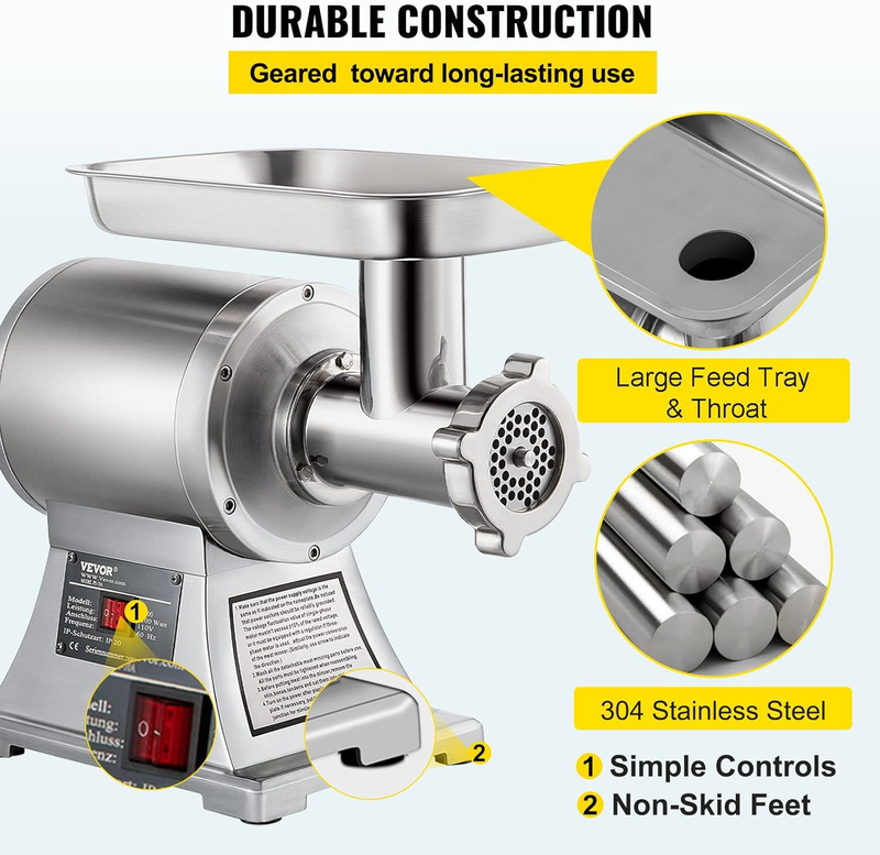 The meat grinder is perfect for restaurants, supermarkets, fast food stores, butcher shops to grind meat for burgers, meatloaf, and so on.