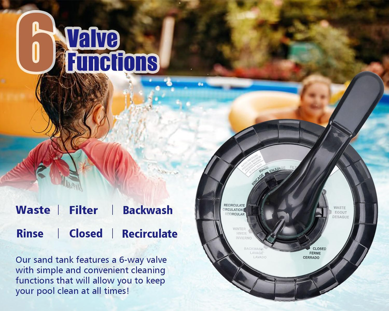 ?Multiport Valve Operation?- A 6-way valve for pool sand filter systems provides superior control with six settings (Filter, Backwash, Rinse, Recirculate, Waste, Closed) to optimize filtration, simplify maintenance, and conserve water. Its durable, leak-resistant design ensures efficient debris removal, extended filter life, and energy savings, while user-friendly operation suits both residential and commercial pools.