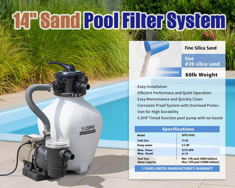 14 Inch Sand Filter Pump System Handy 6-Way Valve for above Ground Pools with 0.5HP Prefilter Pool Pump with Timer 115V 25FT Inline GFCI Power Cord for Easy Installation