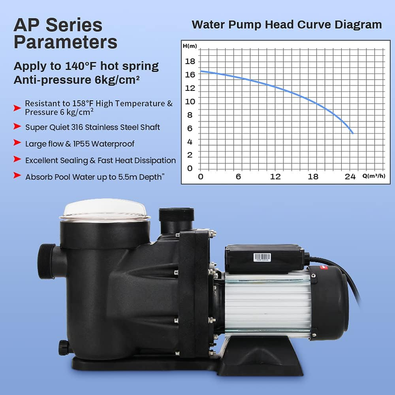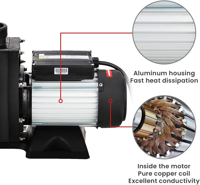 ?Reinforced Pump Body Housing?2.5HP pool pump body is made of reinforced PP material. and the motor of the pool pump is a pure copper motor. The motor shell is made of an aluminum stretched casing. This design can make the pump more heat dissipation and impact resistance.
