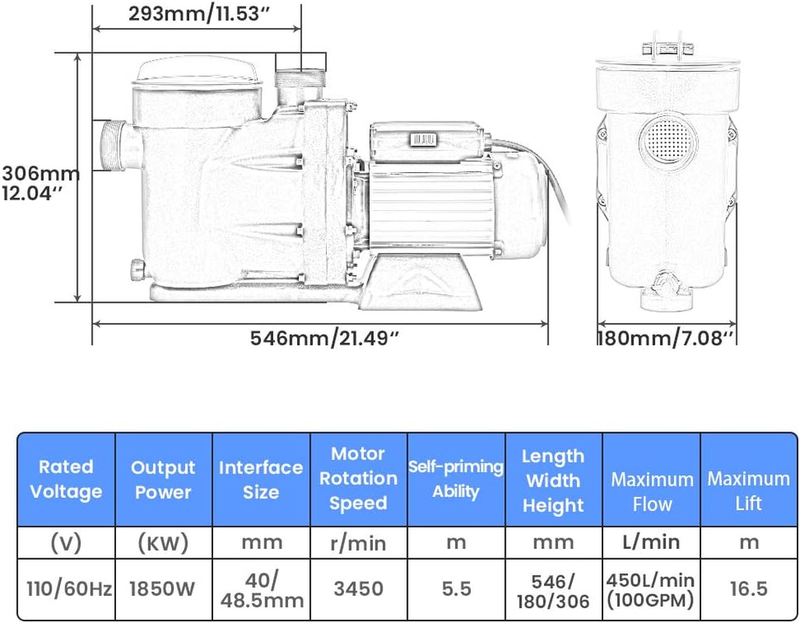 Anbull 2.5HP Swimming Pool Pump, 1850W In/Above Ground Pool Pump with 59.05'' Electric Cord, High Efficiency and Low Noise, Apply to Water Circulation in Filtration System (110-120V/60HZ)