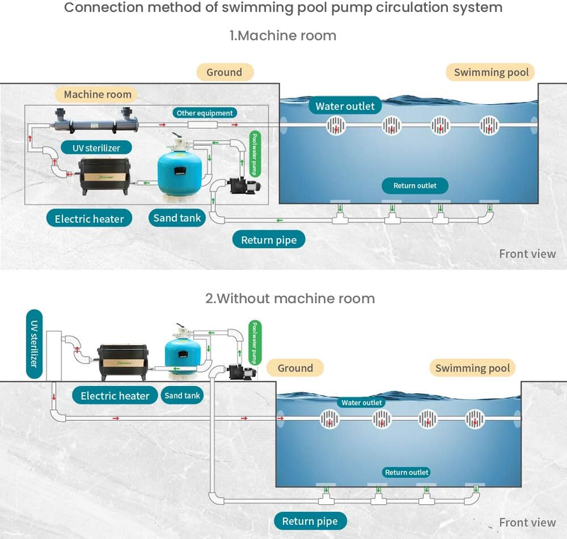 ?Note 1? The swimming pool pump must be filled with water before it can be turned on and run. Otherwise, it will cause dry grinding of the mechanical seal and cause heat generation to damage the impeller, and finally cause the water pump to leak?water) .