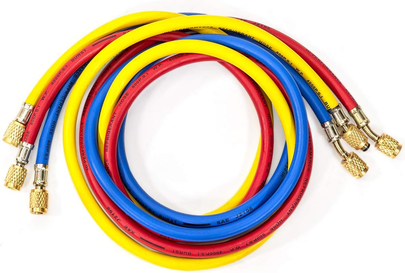 PACKAGE INCLUDED: Multicolored set of three 36? hoses, Manifold Gauge, R134 Can Tap, Vacuum Pump Oil Bottle, Accessories and Storage Bag to keep equipment clean and dust free