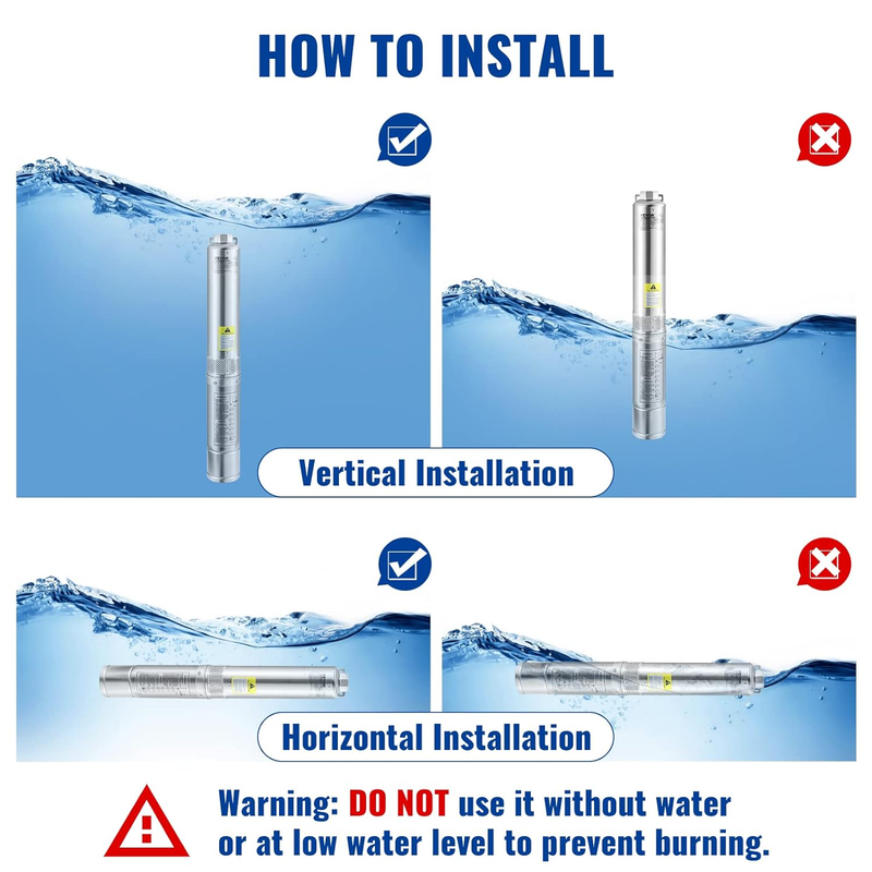Use It Anywhere: Whether you want to solve water supply problems for industry, farmland, or home, this deep water well pump is the one you can trust. It works excellently as a garden water source and sprinkler for the kids. You can use the pump for extracting water from deep wells, reservoirs, canals, rivers, and other water-lifting works. Warning: Put a layer of gauze at the inlet for a new drilled well. Ensure your well casing diameter exceeds the pump diameter by at least 0.39 in/10 mm for optimal fit. Do not use it without water or at low water levels to avoid burning.