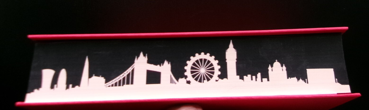 Gilt-stamped red boards, red endpapers, black-and-white city scape page edges; in a wraparound illustrated dust jacket.