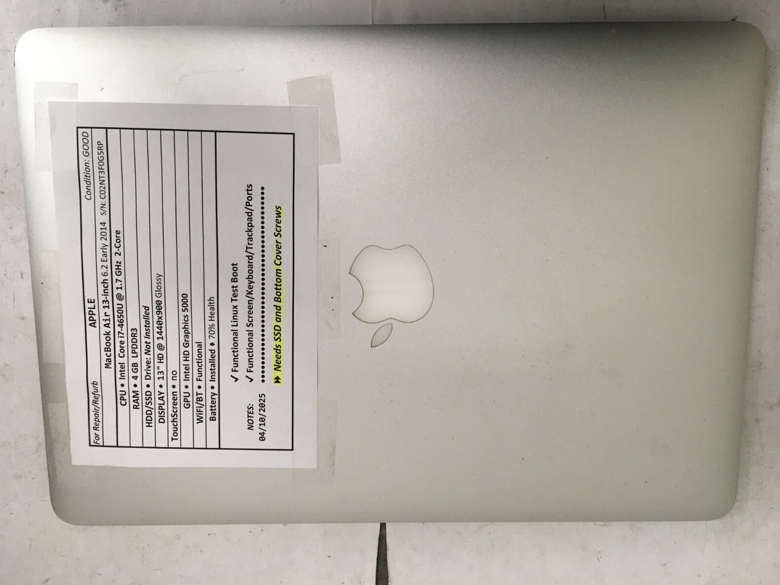 APPLE MacBook Air 13 inch 6.2 Early 2014 , used laptop for parts/repair