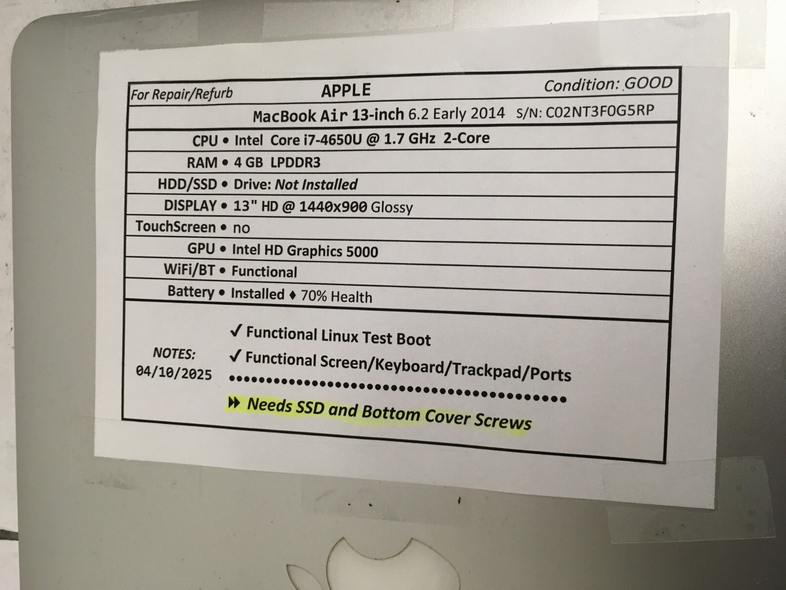 Purchased Apple Macbook Laptop MACBOOK AIR (2010s) on Bonanza