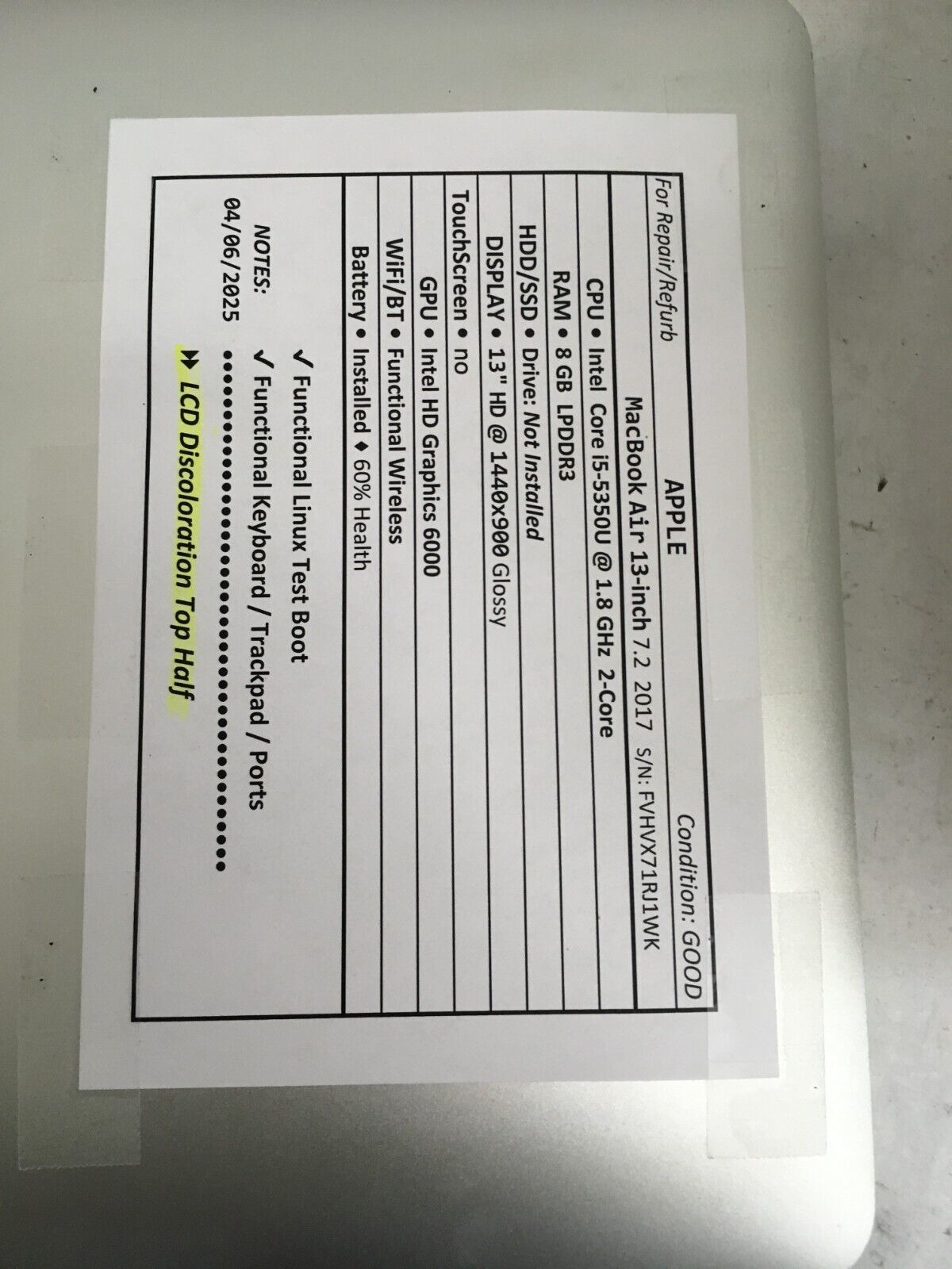 APPLE MacBook Air 13 inch used laptop for parts/repair