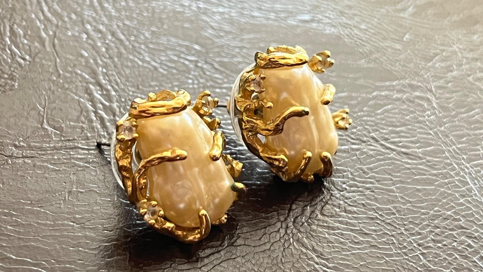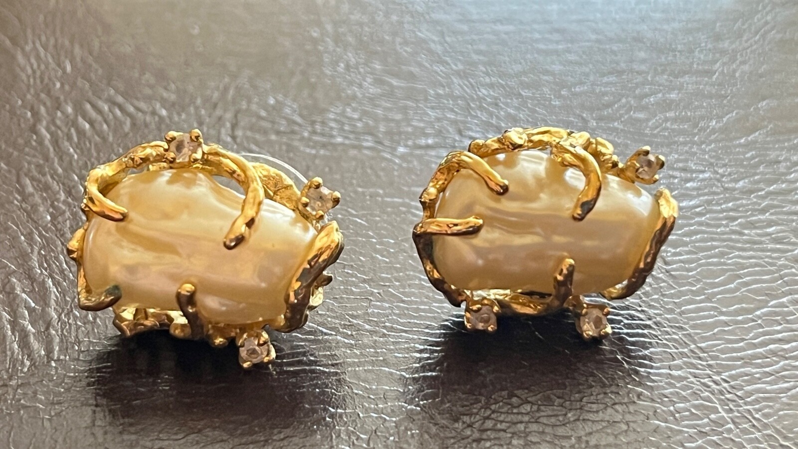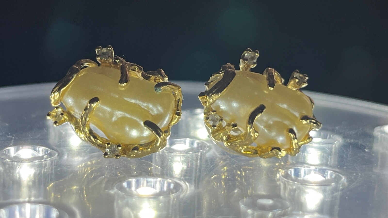 ONE PAIR OF EARRINGS, UNMARKED. FRESHWATER PEARLS IN A SETTING MADE TO LOOK LIKE CORAL BRANCHES, EACH WITH THREE SMALL STONES. AN ACID TEST SUGGESTS 10k GOLD OR GOLD PLATE, THE STONES MOST LIKELY CUBIC ZIRCONIA. PLEASE EXAMINE ALL PHOTOS CAREFULLY, AS THEY ARE PART OF THE DESCRIPTION.