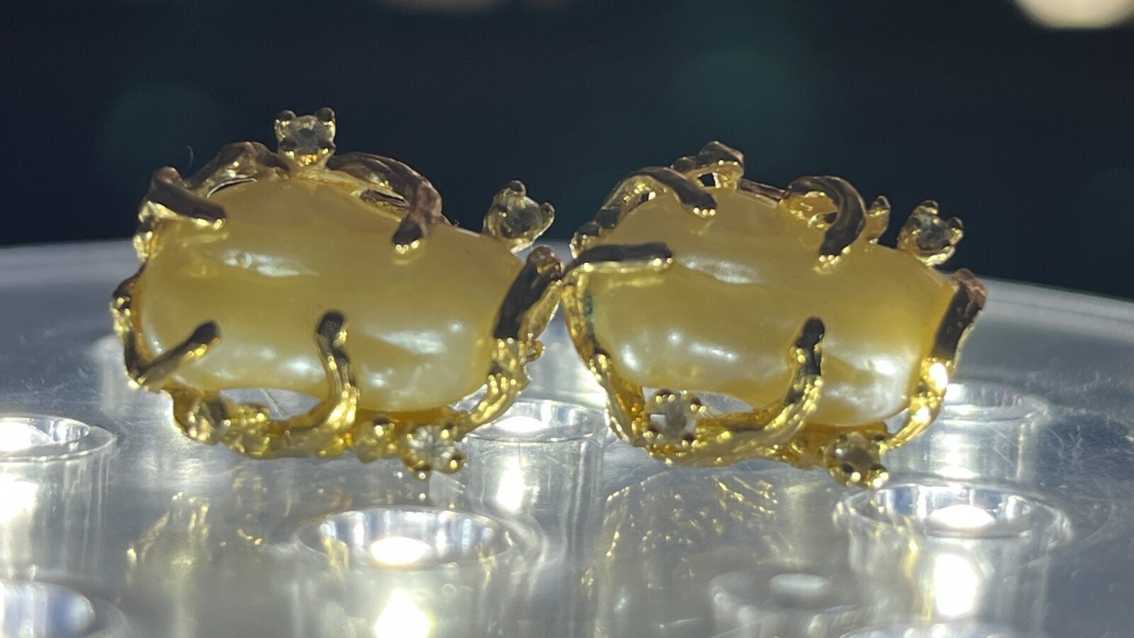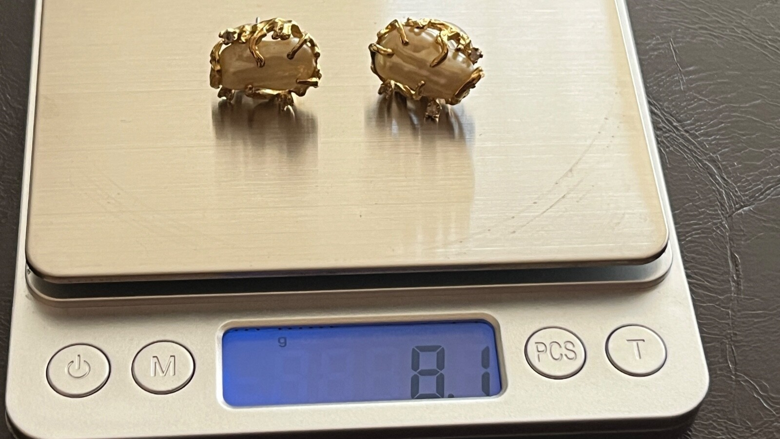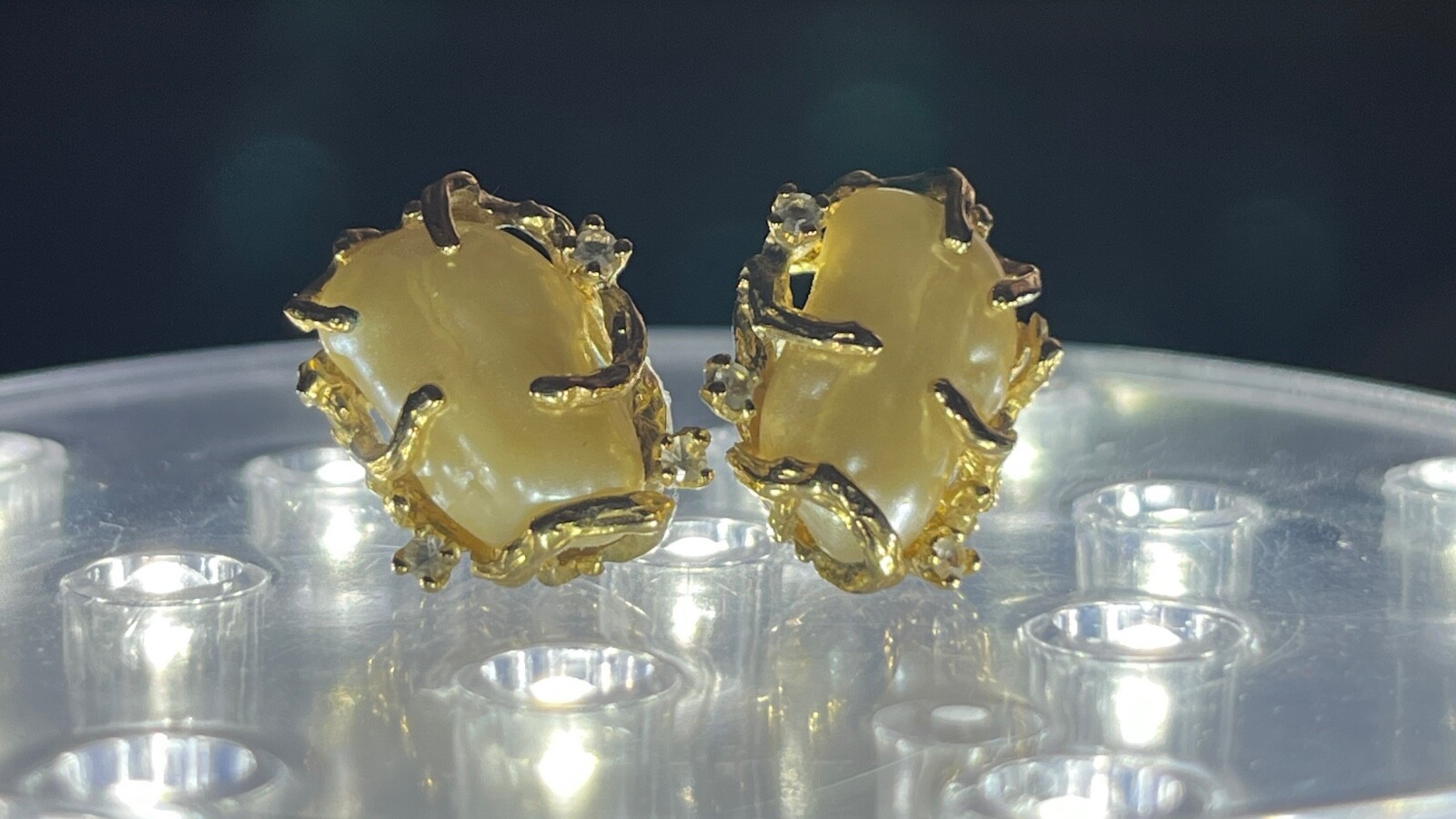 ONE PAIR OF EARRINGS, UNMARKED. FRESHWATER PEARLS IN A SETTING MADE TO LOOK LIKE CORAL BRANCHES, EACH WITH THREE SMALL STONES. AN ACID TEST SUGGESTS 10k GOLD OR GOLD PLATE, THE STONES MOST LIKELY CUBIC ZIRCONIA. PLEASE EXAMINE ALL PHOTOS CAREFULLY, AS THEY ARE PART OF THE DESCRIPTION.