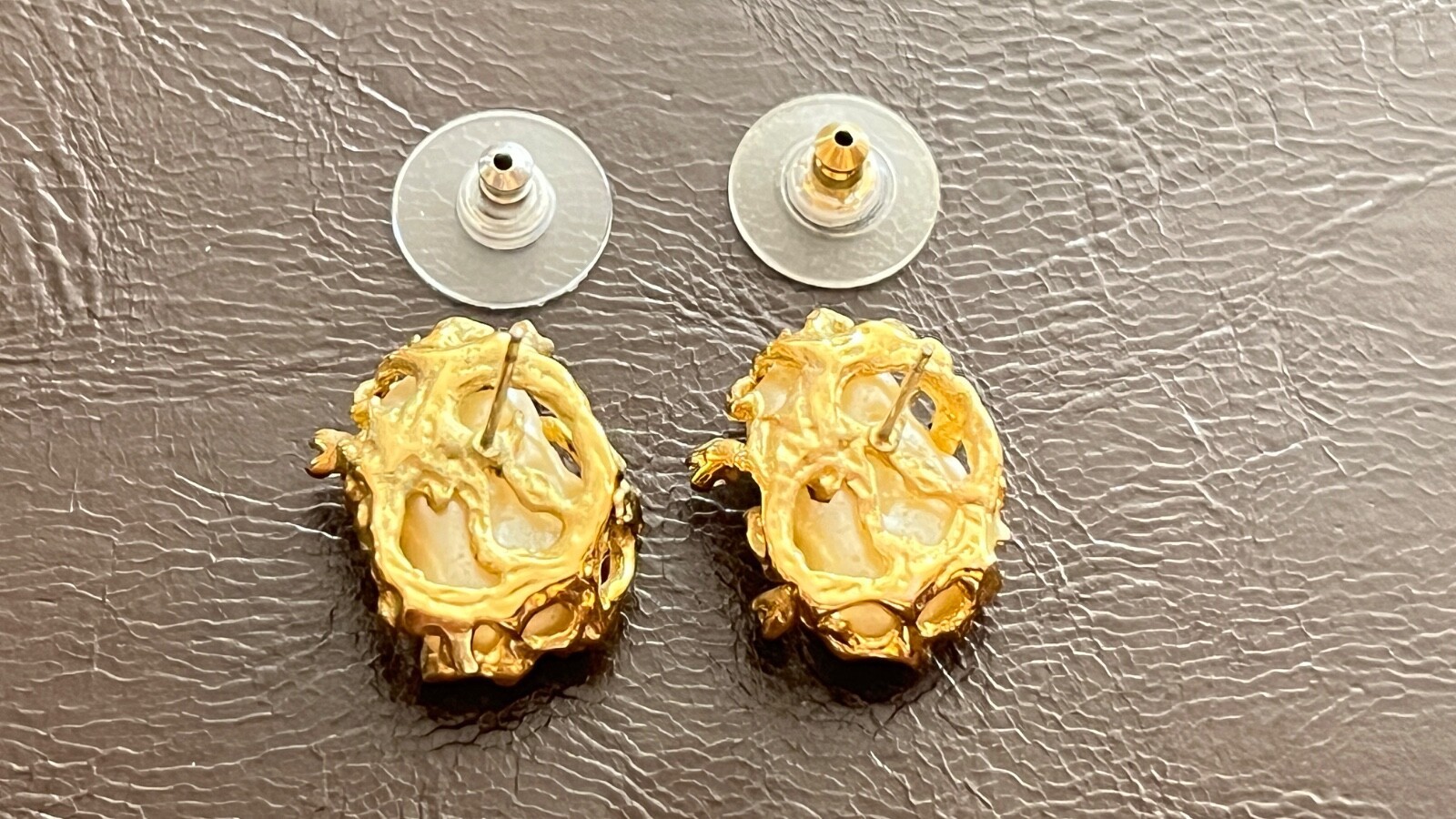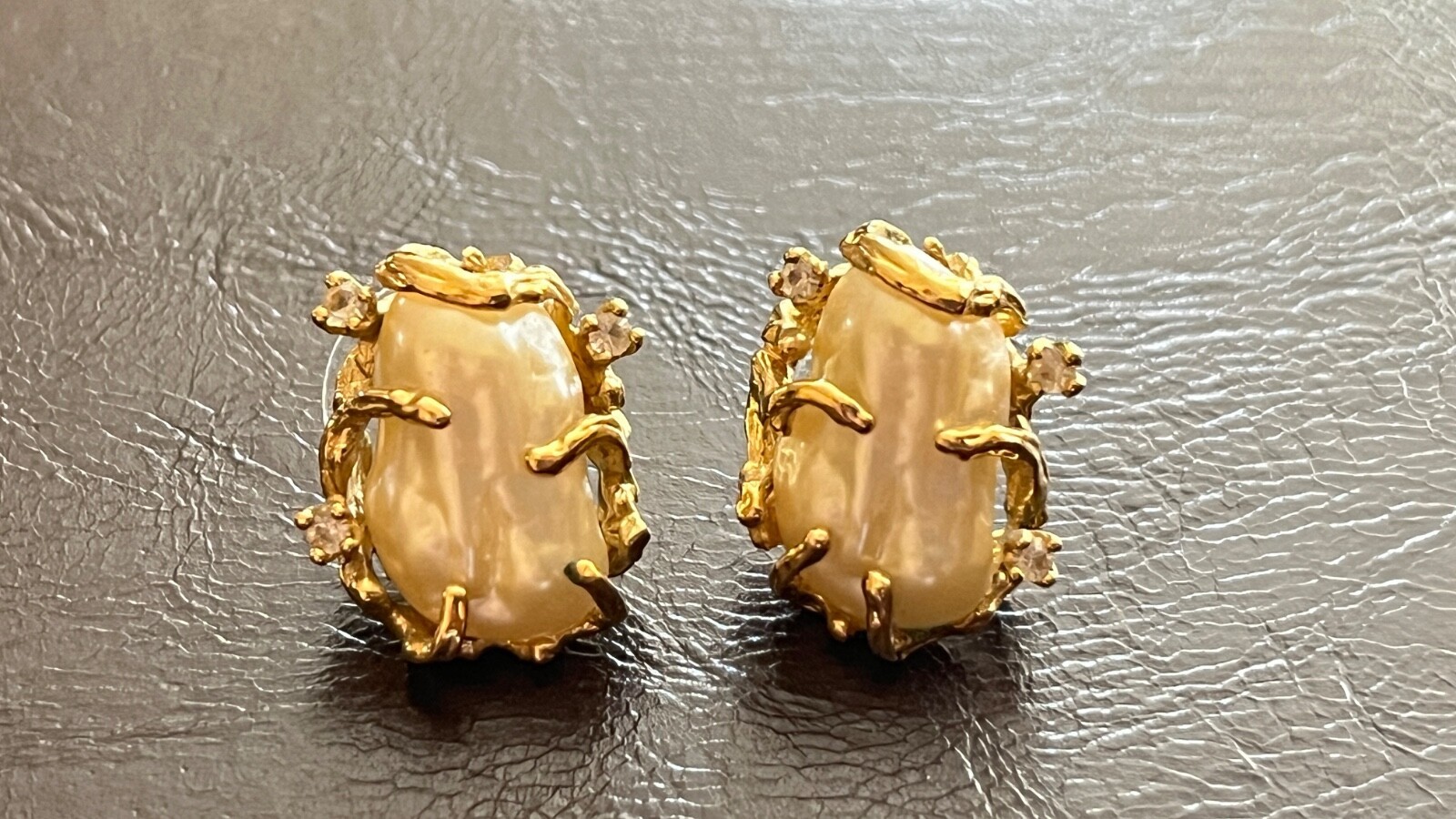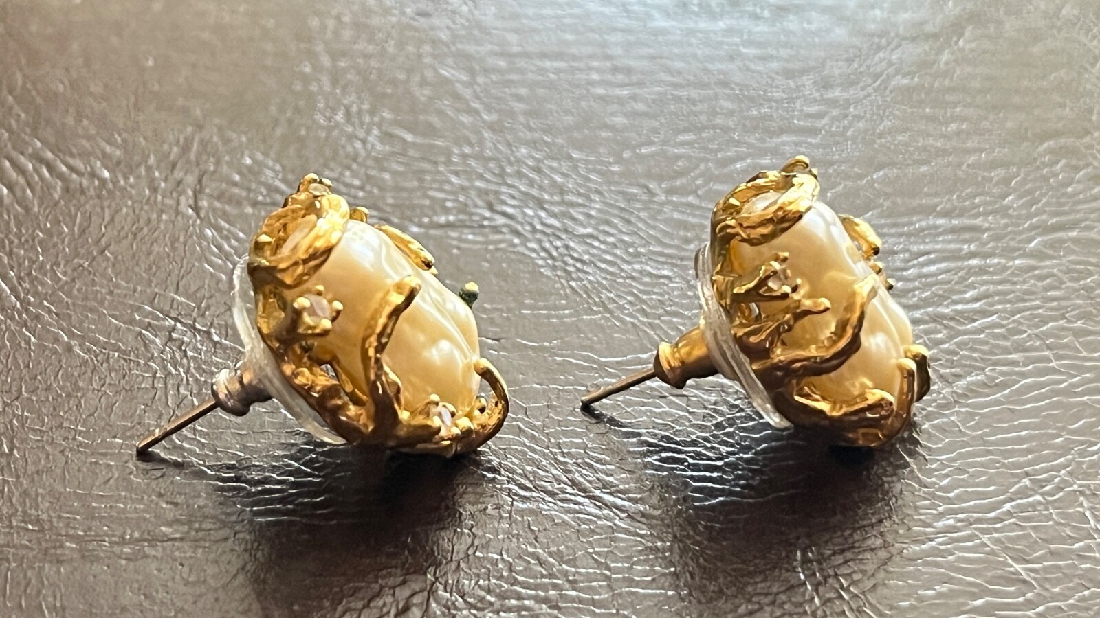 Large Freshwater Pearl Pierced Earrings Gold Plated faux coral branch setting CZ