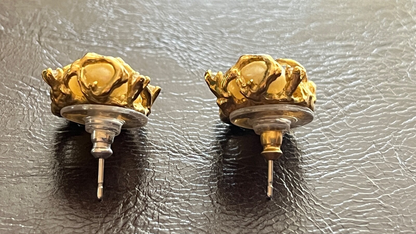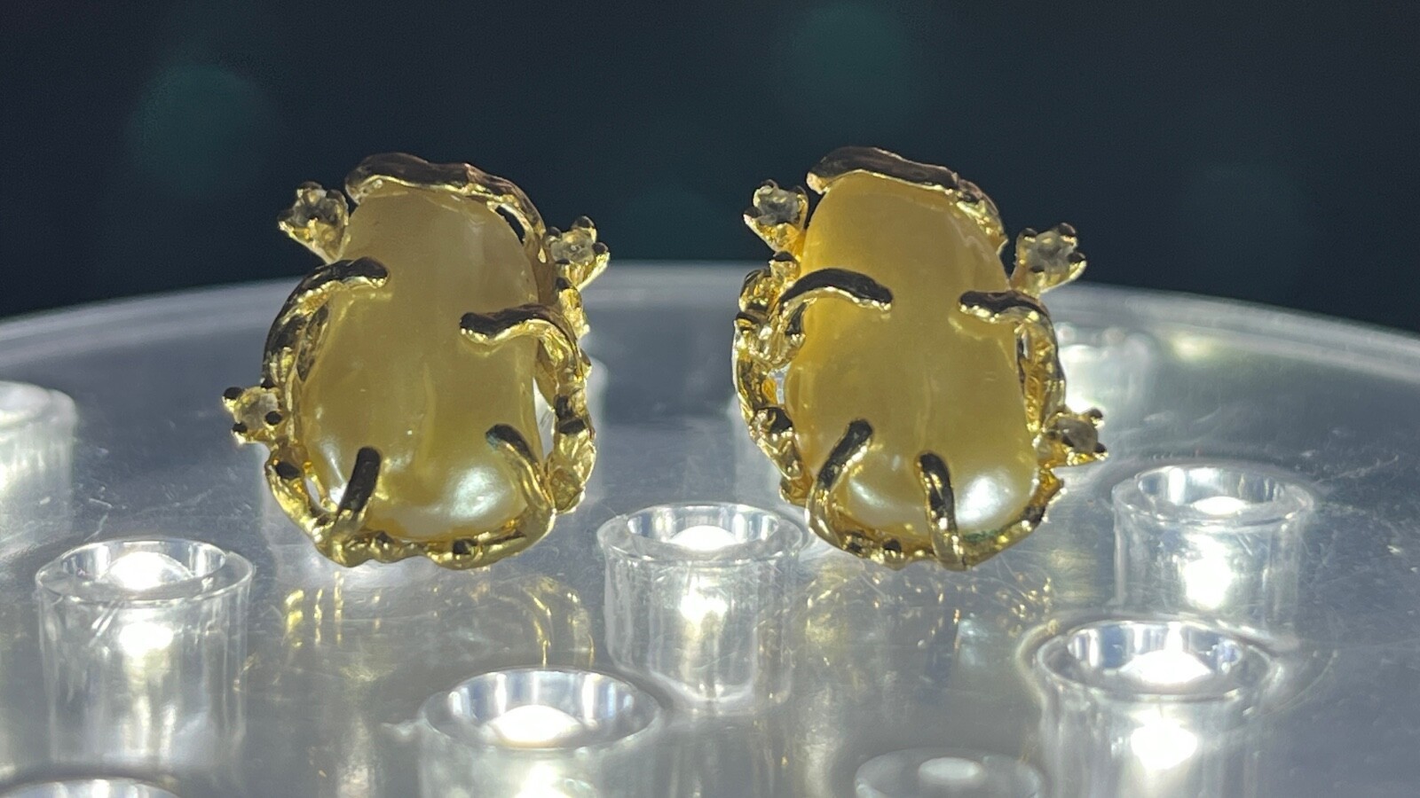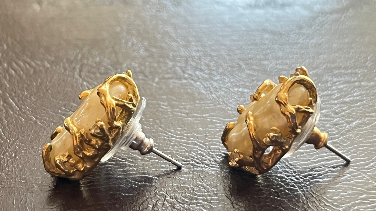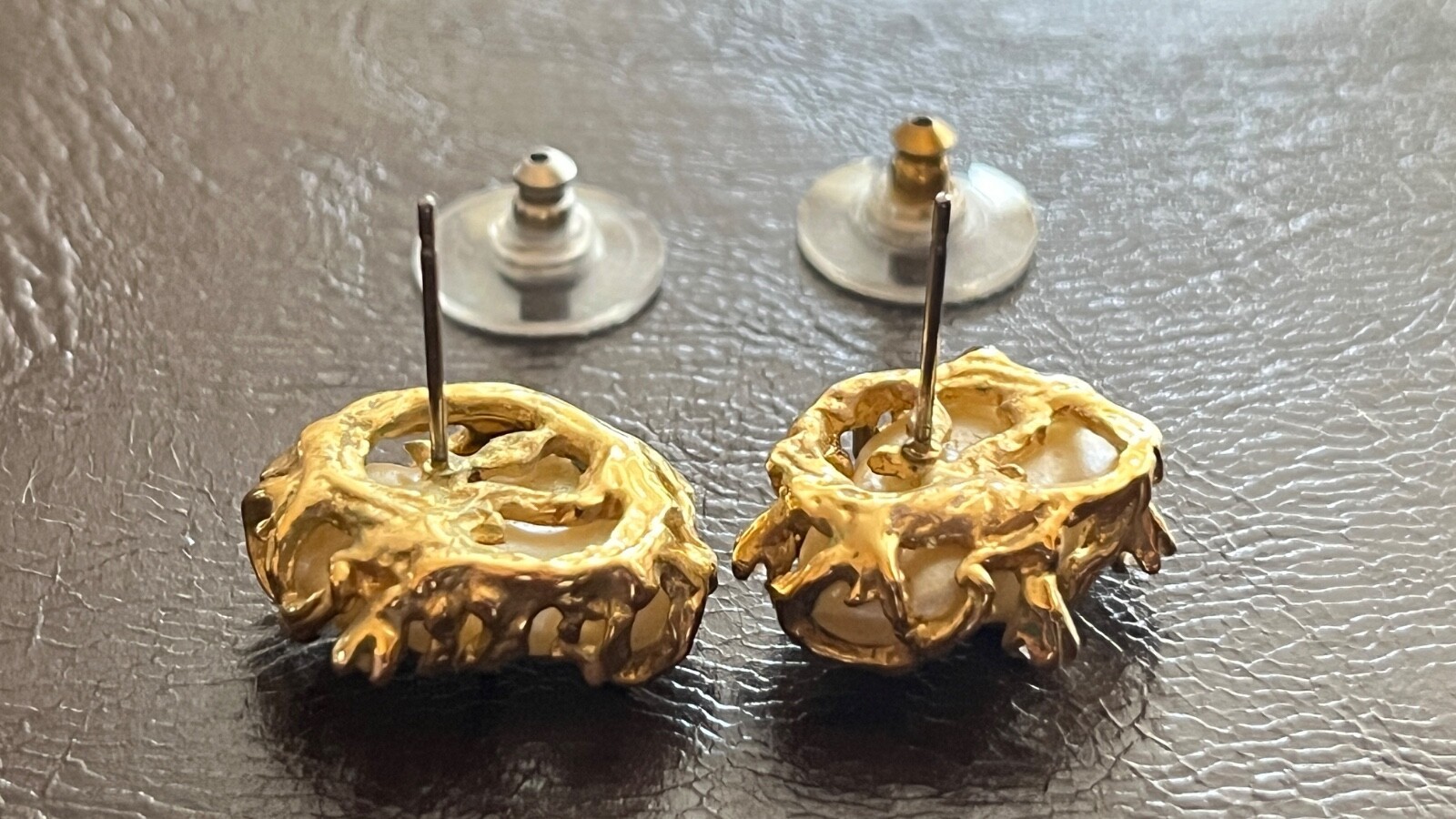 Large Freshwater Pearl Pierced Earrings Gold Plated faux coral branch setting CZ