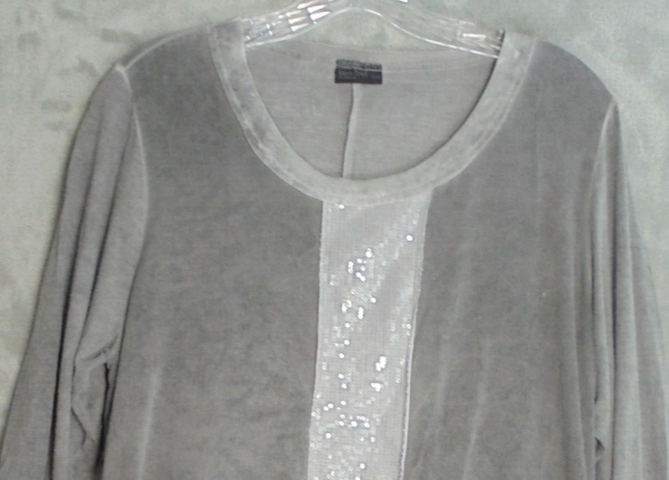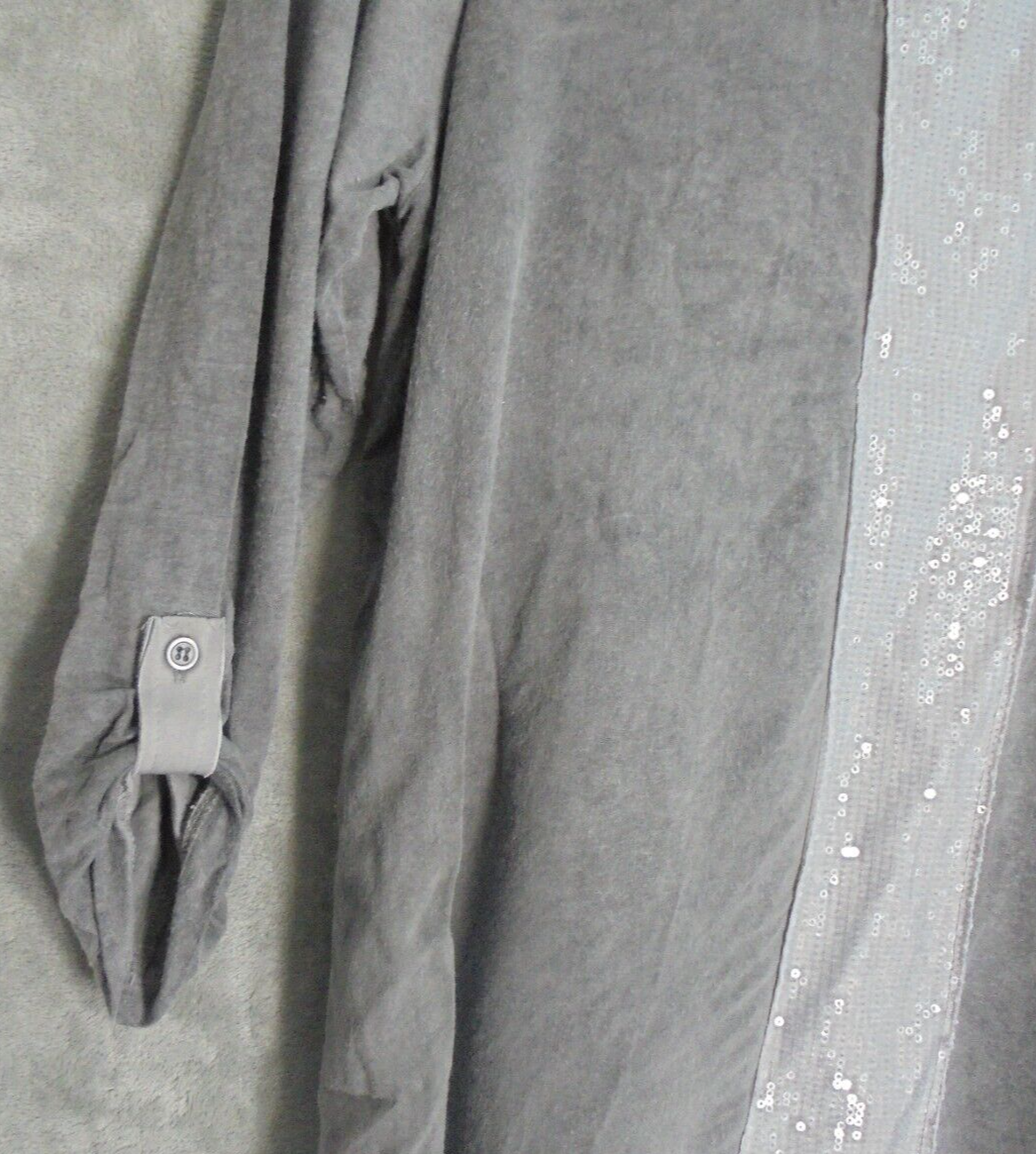 Description: Pretty pullover top with roll tab sleeves. Strip of silver sequin sparkles down front. Scoop neck with band of gray material.