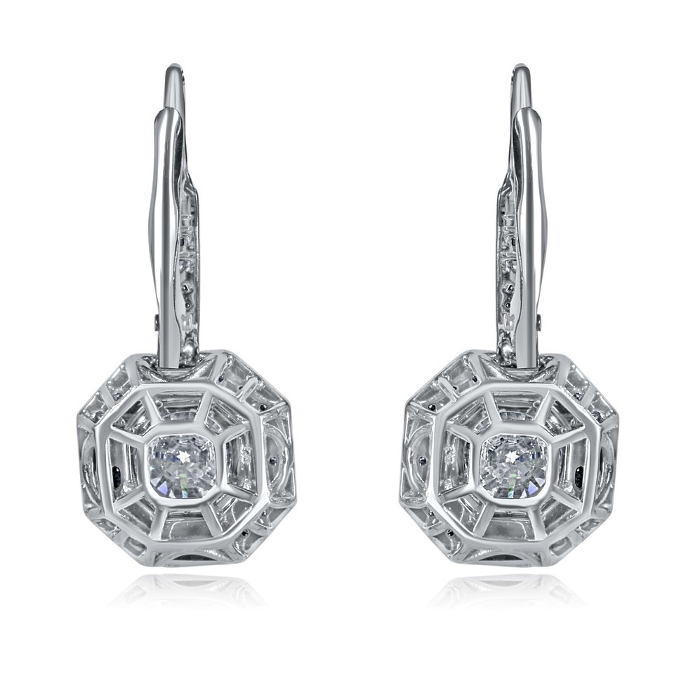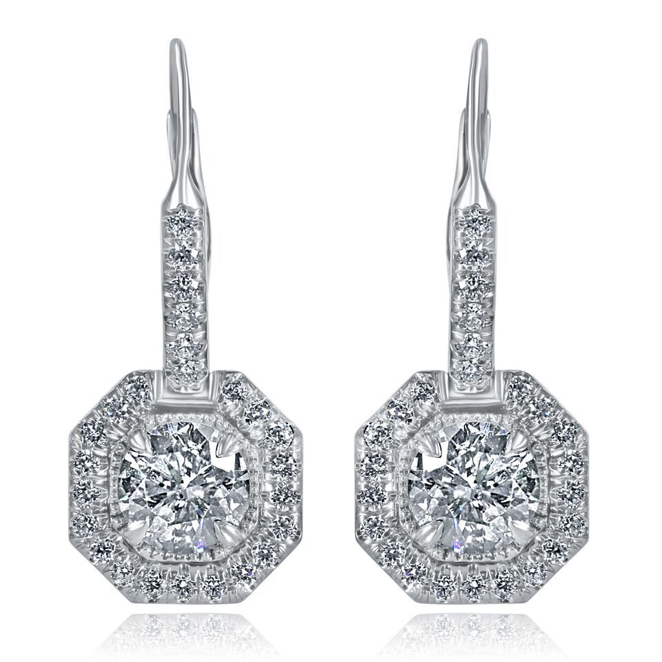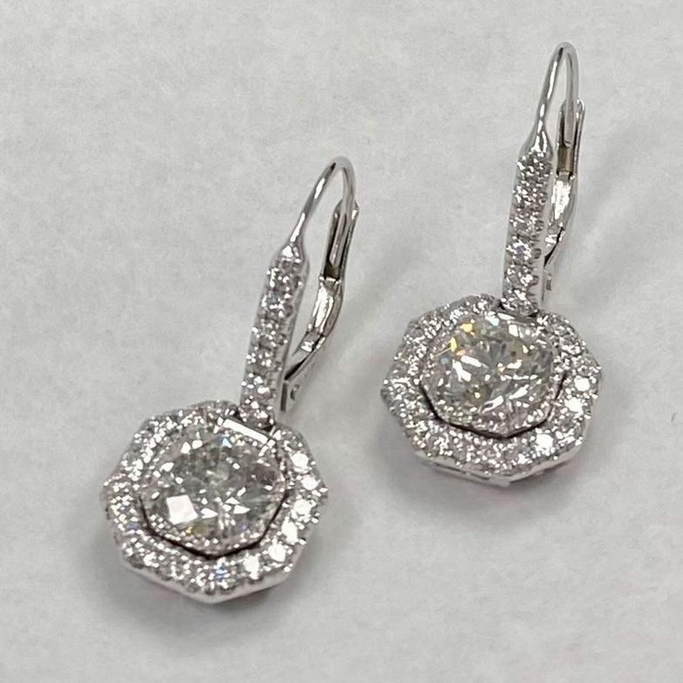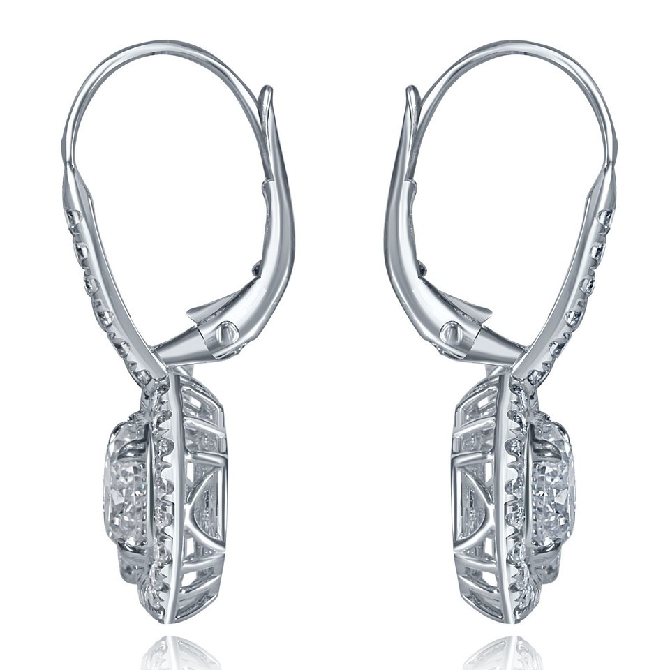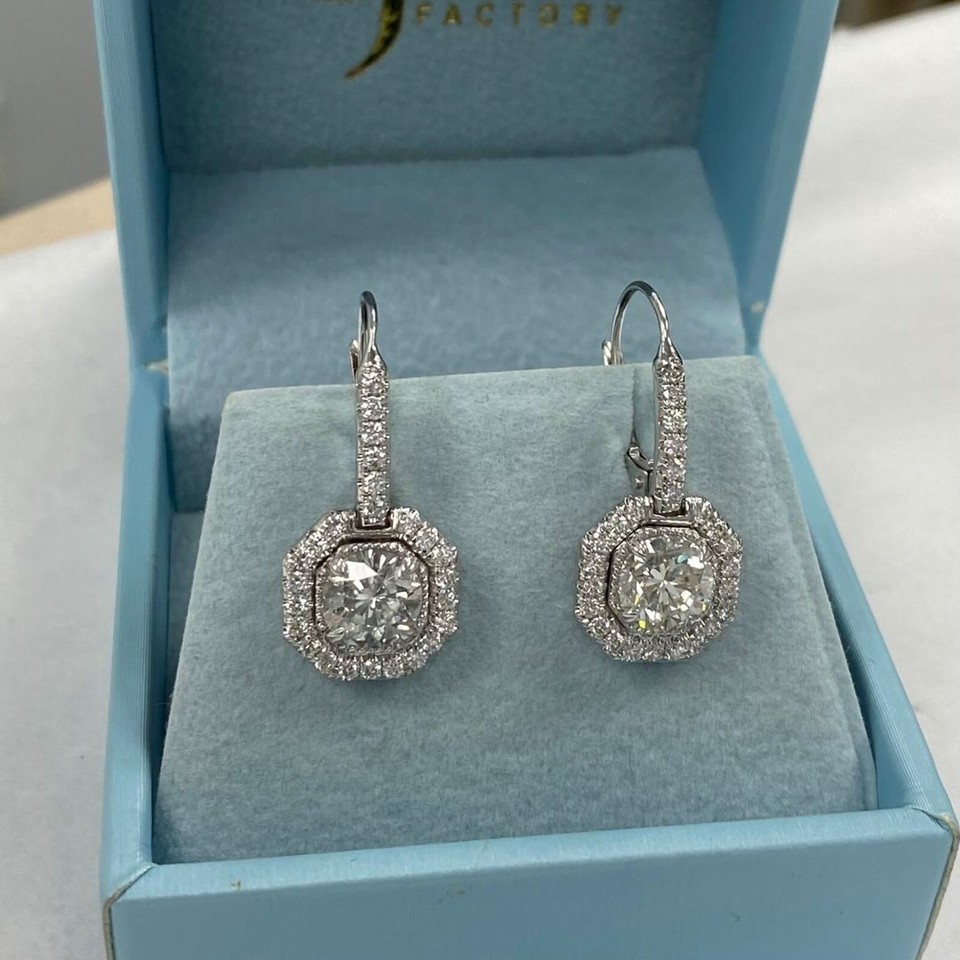 Authenticity Guarantee 3.24 TCW Round Cut Diamond Halo Drop Lever Back Earri...